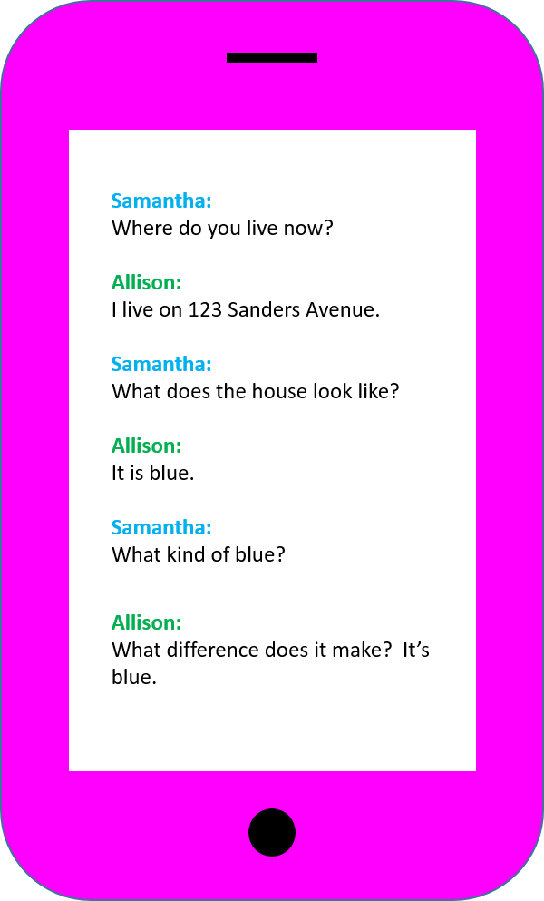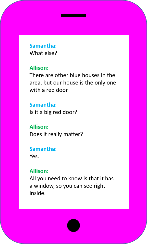 Short Version: Allison lives on 123 Sanders Avenue in a blue house with a red door. It also has white trim and potted plants outside the windows. However, one of its most distinguishing features is that it is the only house on the block with a fenced-in yard.