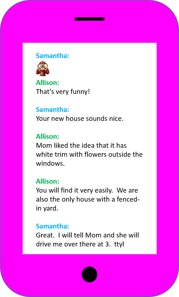 Long Version: Allison’s blue house is on 123 Sanders Avenue. It has a red, wooden door with a window. Since it is not covered, you can see right through it. From the outside, you will also notice the white trim. The windows are framed with white, colonial shutters. There are also potted flowers hanging on the frame of each window. These plants are perennials, so they bloom each year. However, what really distinguishes it from the other houses on the street is the fenced-in yard. The picket fence protects her 2 dogs from running out into the street.