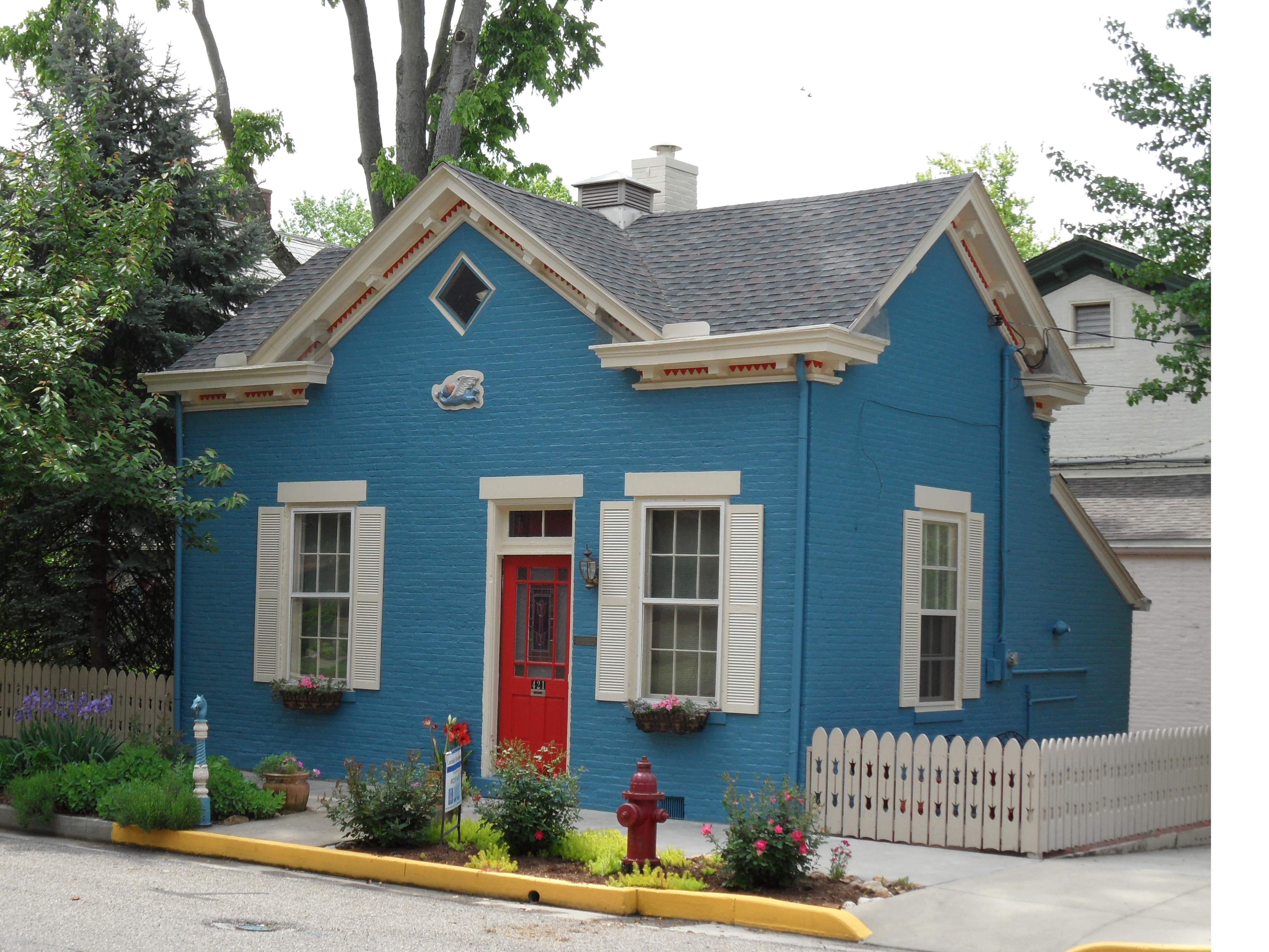 Allison’s blue house is on 123 Sanders Avenue. It has a red, wooden door with a window. Since it is not covered, you can see right through it. From the outside, you will also notice the white trim. The windows are framed with white, colonial shutters. There are also potted flowers hanging on the frame of each window. These plants are perennials, so they bloom each year. However, what really distinguishes it from the other houses on the street is the fenced-in yard. The picket fence protects her 2 dogs from running out into the street.