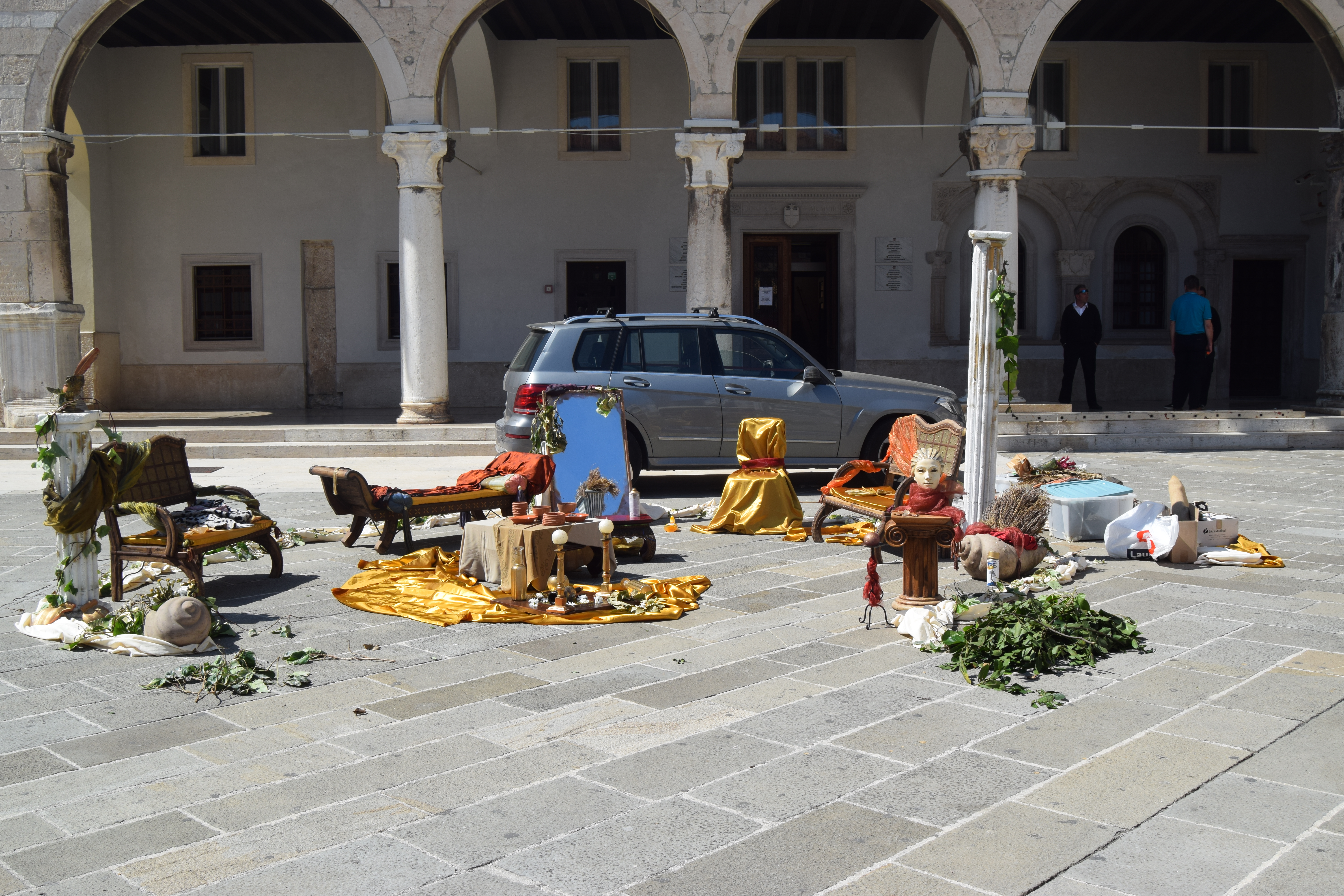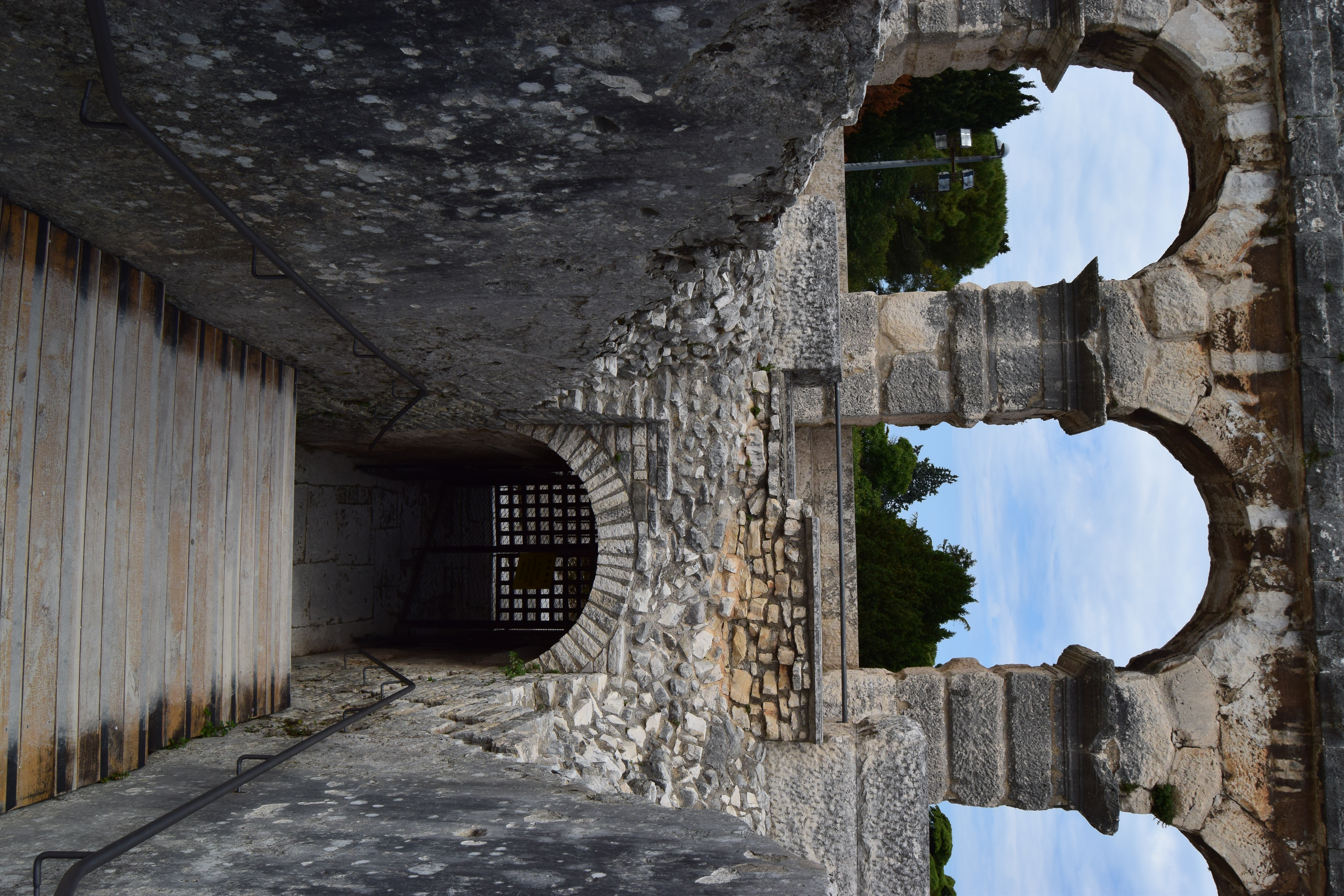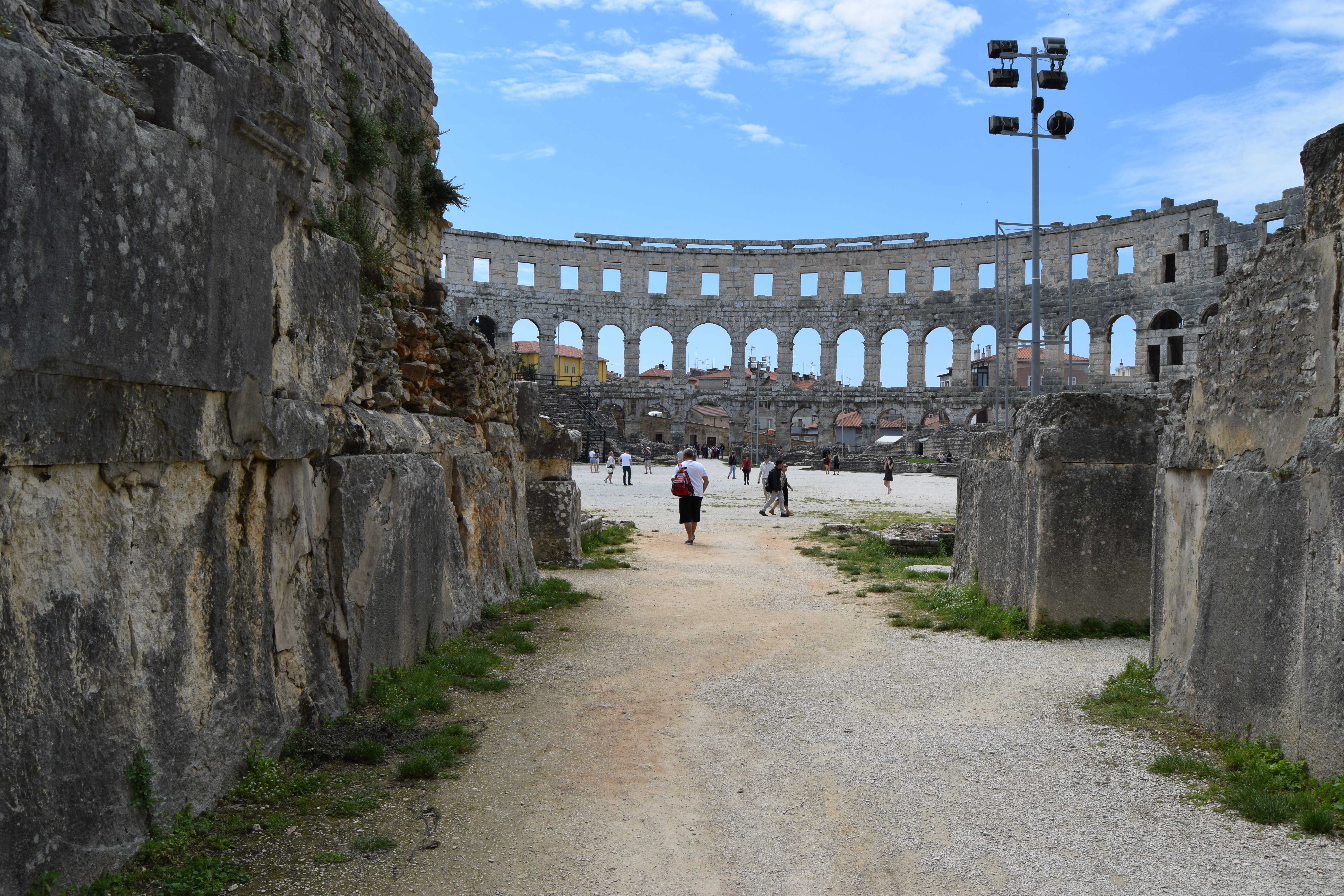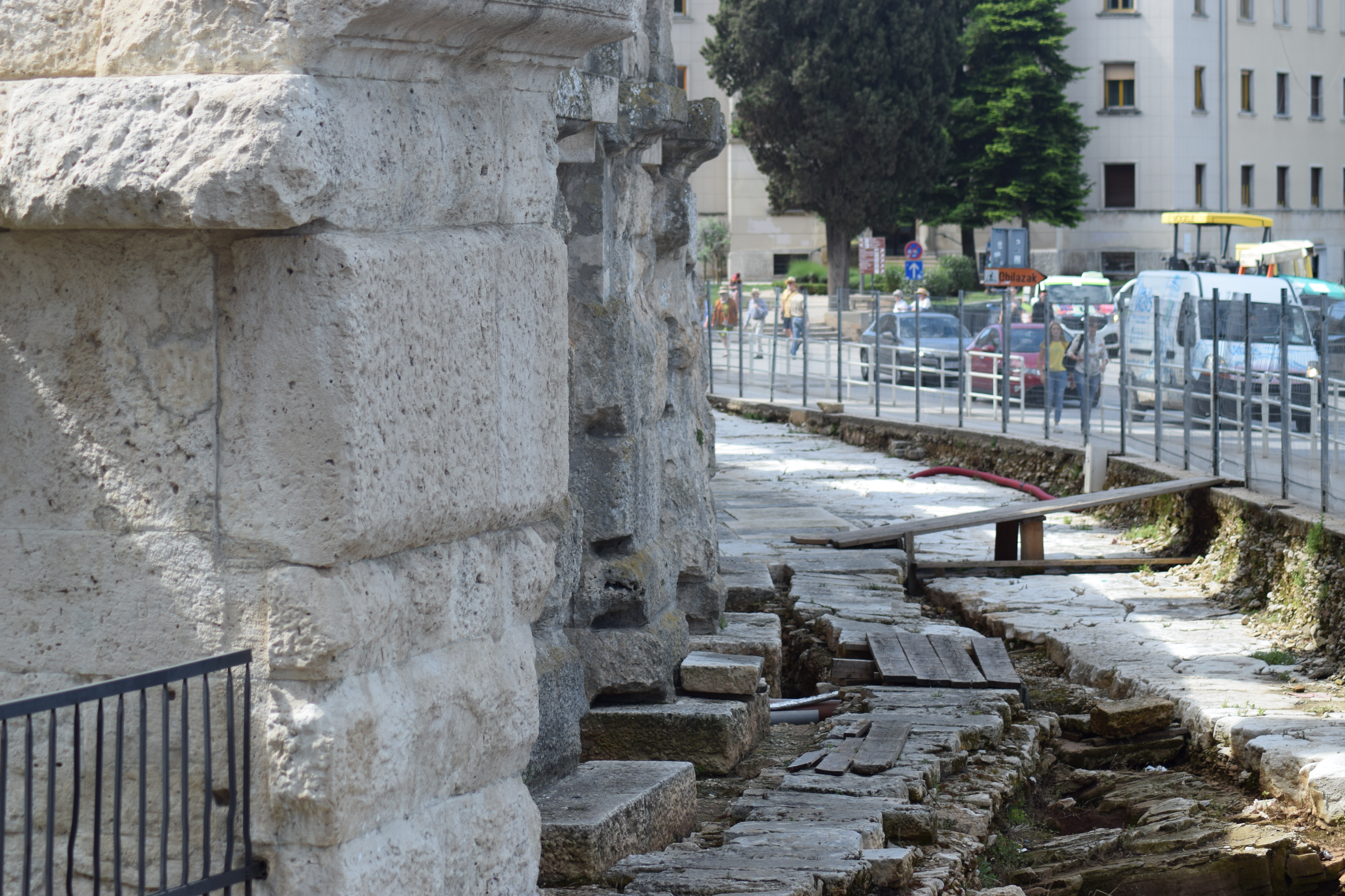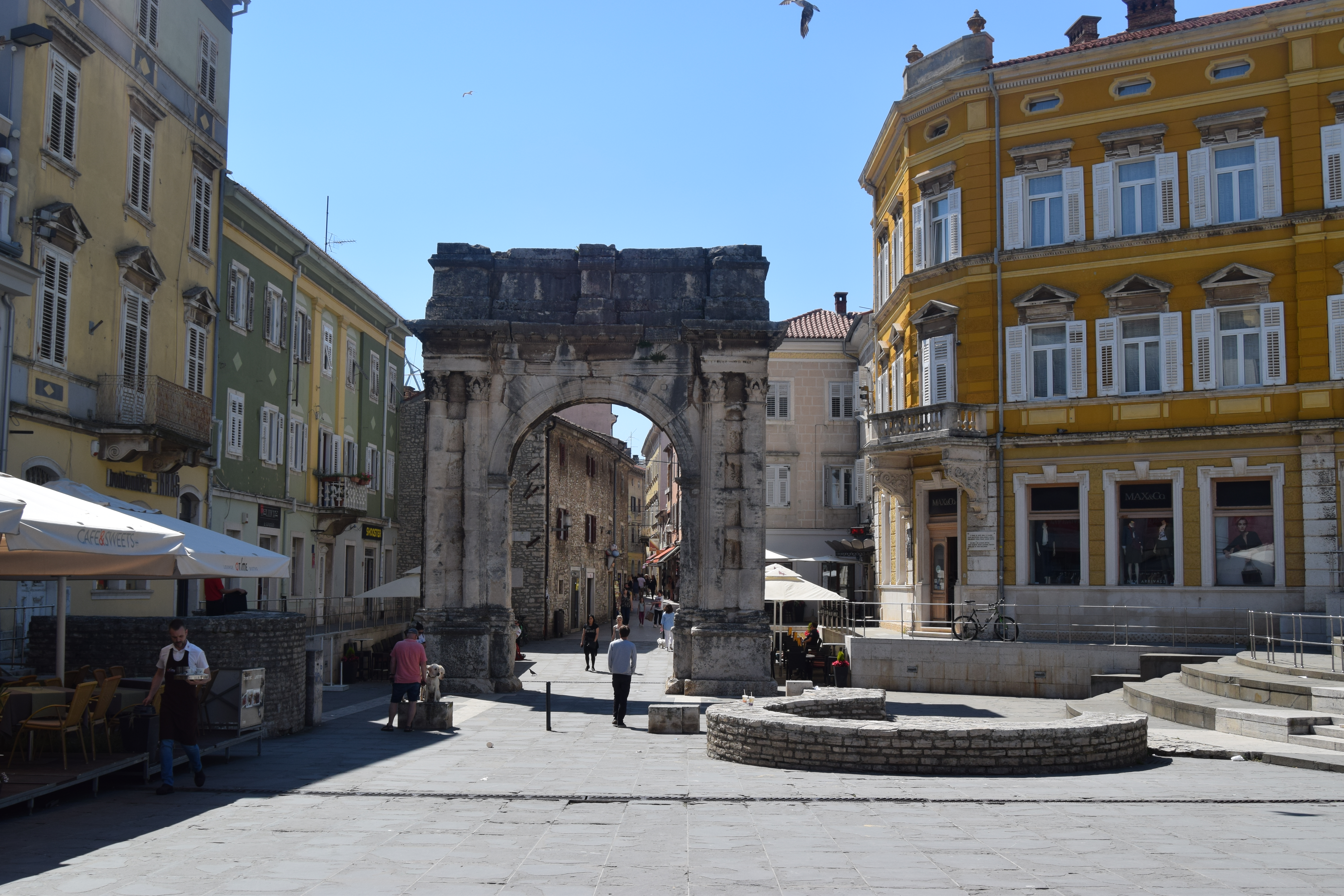 The city was fortified by walls and was entered through some ten gates. Only some of the gates have been preserved and are observable until now The Triumphal Arch of the Sergi is situated at the end of the street (Via Sergia) leading eastwards from the Forum. This triumphal arch leaned against the city gate (Porta Aurea) so that only its western, visible side was richly decorated.