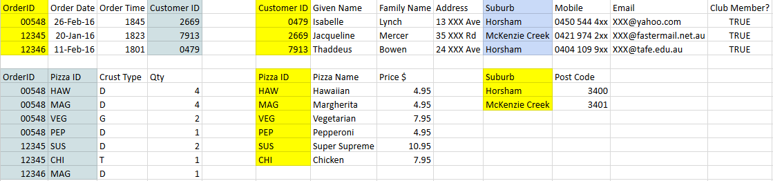 - Testing the relationships (otherwise known as referential integrity) should be completed - where for each Order Detail line there must be an Order and a Pizza existing in the appropriate tables (tblOrders and tblPizzas) and for each Order there needs to be a Customer who has an address in an acceptable Suburb existing in the appropriate tables (tblCustomers and tblPostcodes). This can be tested by trying to insert records into tables where they have no related record.
