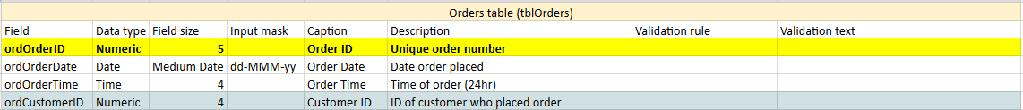 Note the use of prefixes for the table (tbl) and fields (ord) as well as the use of different data types for each field. There are two input masks: ordOrderID has an input mask of five underlines which indicates an underline will be placed in the data entry field for the operator to type over. ordOrderDate has an input mask of dd-MMM-yy which means that each date will be stored in the 9-Apr-16 format. Captions are short and meaningful, as are the descriptions. No validation is needed for this table.