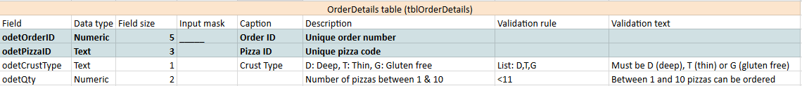 The odetOrderID field needs to be stored in an identical way to the ordOrderID field because of the one to many relationship. The odetPizzaID will be stored identically to the PizzaID field to be created in another table, again to allow for a database relationship to be created. Validation rules and validation text details have been created for the Crust type (odetCrustType) and Quantity (odetQty) fields.