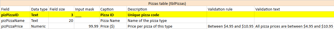 Note that the pizPizzaID has the same data dictionary values as the odetPizzaID in the tblOrderDetails table. An input mask of 99.99 has been created for pizPizzaPrice as well as validation rules and text. (Note: The numeric data type for pizPizzaPrice will need to be clarified when we actually create the database to ensure that the decimal places can include cents and are not just rounded to the nearest integer value.)