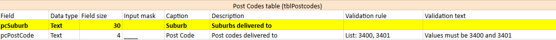 There are only two fields in this small table, however both need to be correctly defined. pcSuburb needs to be created identically to cusSuburb to allow a relationship to be generated. pcPostCode needs to have a validation rule and validation text created to ensure that only people from 3400 and 3401 codes can get their tasty pizzas delivered.