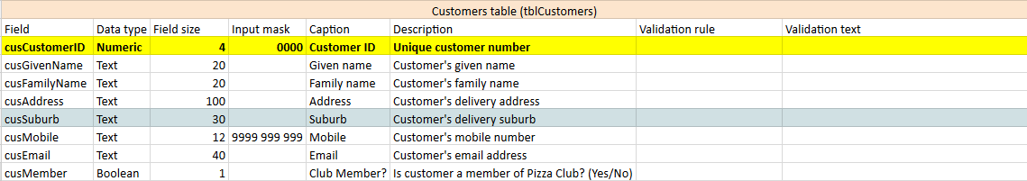 Shown above is a standard customers table apart from possibly the recording of membership details in a Boolean (yes/no) field. There are two input masks required for the cusCustomerID and cusMobile fields.
