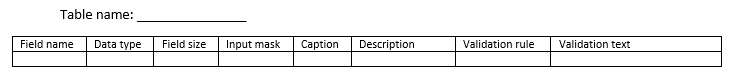 - Input mask: List specifically if there are any input masks to guide data input. Remember conventions shown earlier (9 for numbers, 0 for leading zeroes, spaces for mobile phone numbers).
