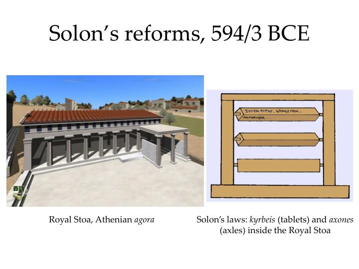 - He increases the number of Athenians who can participate in government. To hold office one had to be born an aristocrats. Solon changes that. Anyone with a certain amount of wealth can now hold office. The middle class merchants moves into Athenian government.