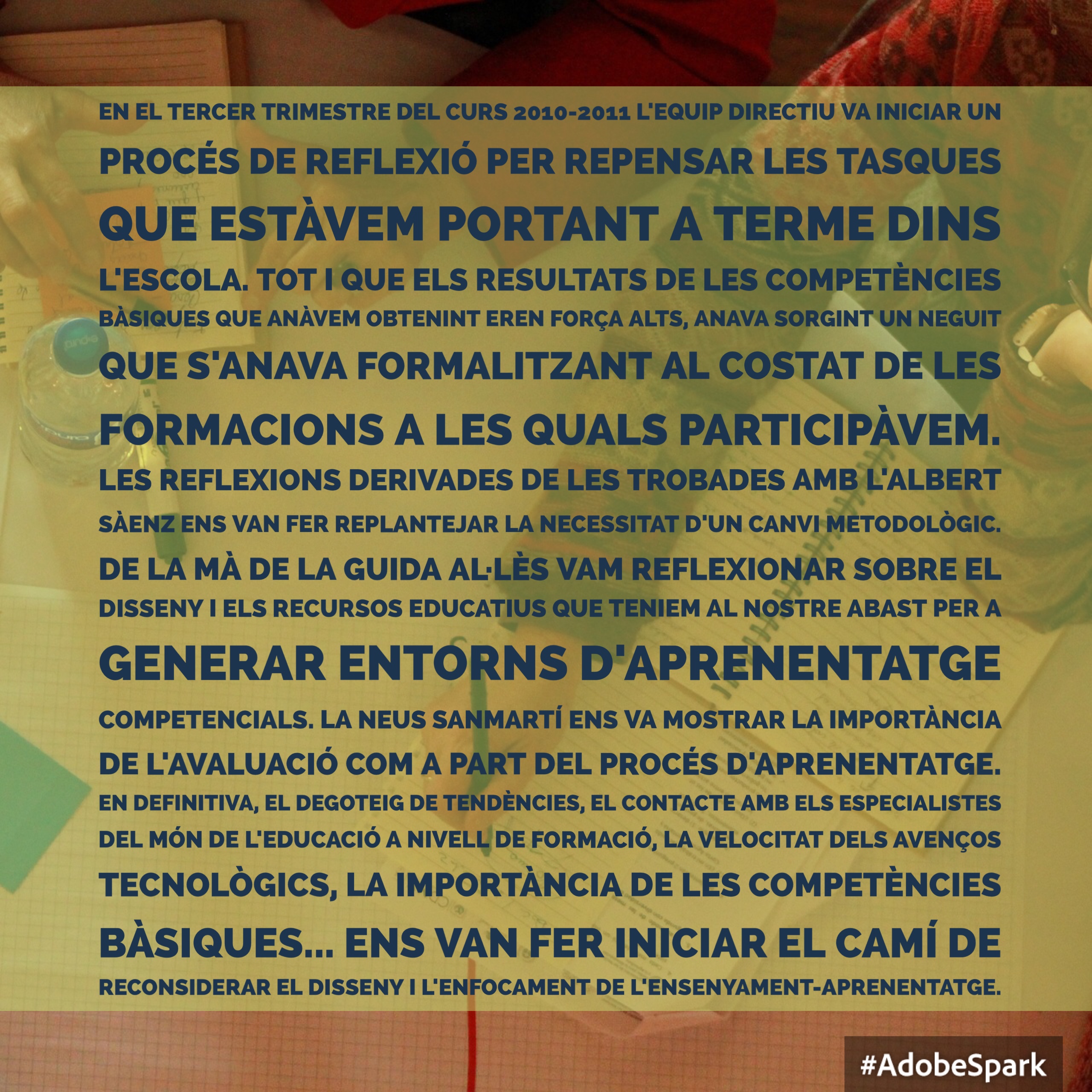 La integració de les tecnologies en els processos d’ensenyament aprenentatge ha esdevingut el motiu d’una reflexió profunda en la nostra escola, sobre les pràctiques docents i de compartir les visions metodològiques del professorat. L’eix central de la reflexió ha estat plantejar-se com adoptar les tecnologies de la informació i la comunicació a l’escola per tal que estiguin al servei de l’aprenentatge i el coneixement