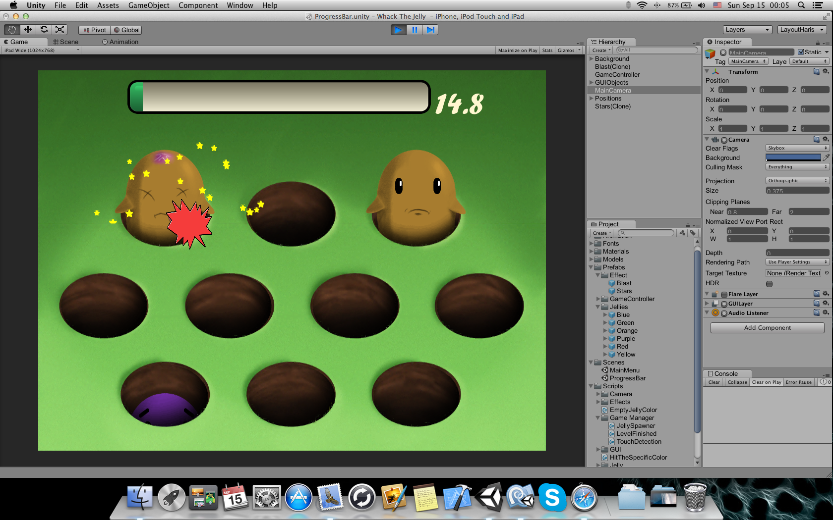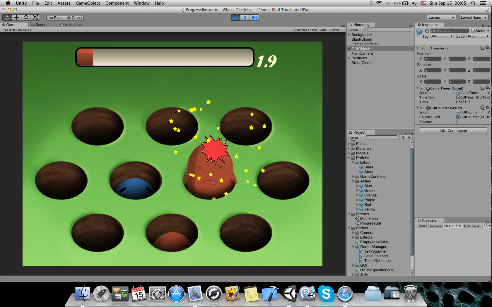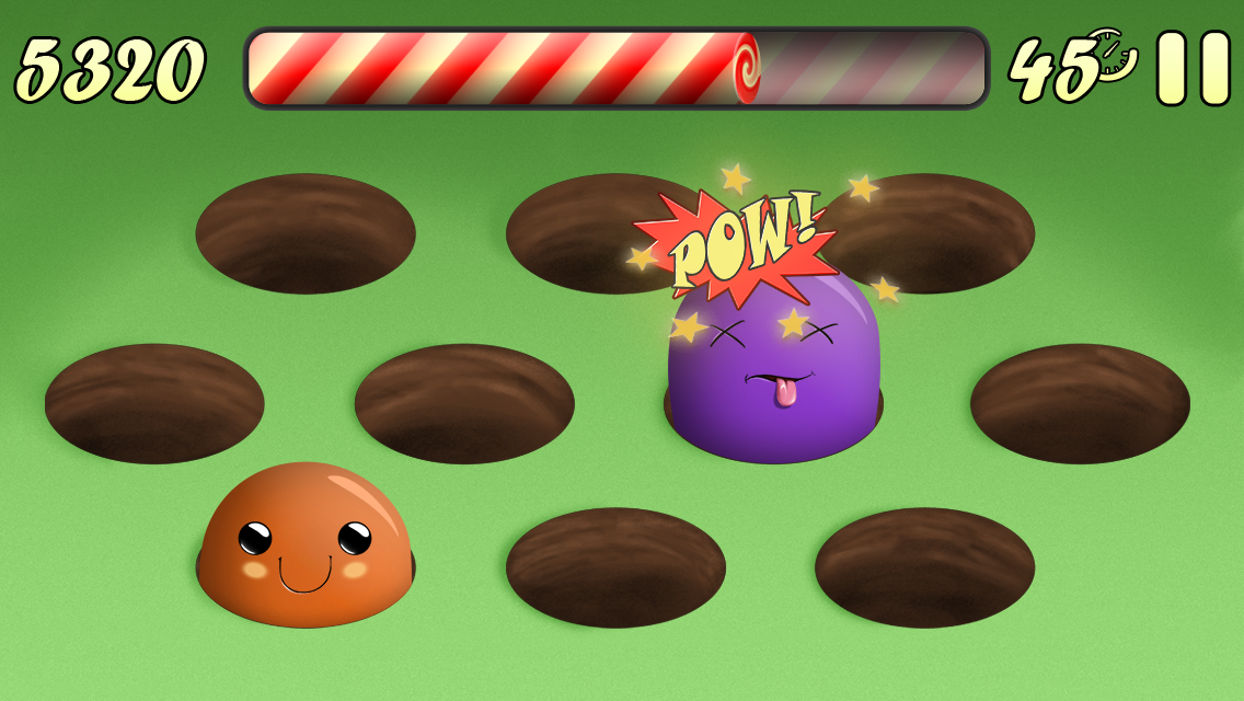 2D game, you have to tap the correct color of the jelly popping character in order to full fill the bar. If the player taps the wrong one the bar decreases.