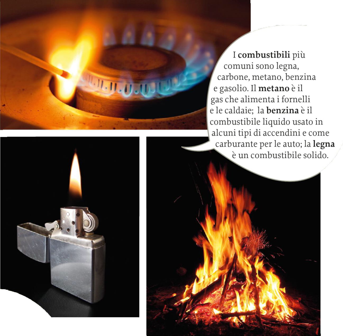 Quando guardiamo un fornello acceso, stiamo osservando una reazione chimica: il gas brucia e vediamo una amma che emette luce e calore. Queste reazioni sono chiamate combustioni. Nelle combustioni i reagenti sono i combustibili e l’ossigeno contenuto nell’aria; i principali prodotti sono il diossido di carbonio e l’acqua. I combustibili, cioè i materiali che bruciano, possono essere sostanze omiscele,ma tutti hanno una caratteristica comune: sono costituiti soprattutto da atomi di carbonio e di idrogeno.
