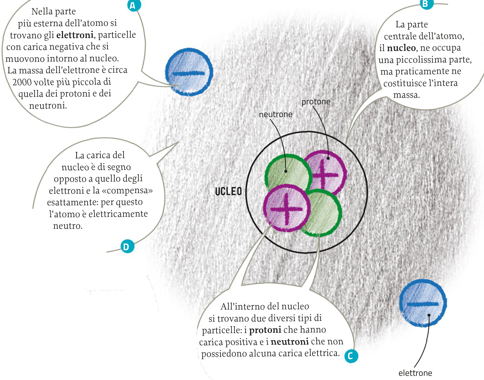 Gli elettroni si muovono a grande distanza dal nucleo: se immaginiamo il nucleo grande come una mela, gli elettroni si troverebbero a circa 1 km di distanza. Essi sono disposti in zone dette gusci elettronici, via via sempre più lontani dal nucleo. Consideriamo gli elementi del primo periodo: a parte il primo guscio, che può ospitare solo due elettroni, tutti gli altri ne possono contenere no a otto. Un atomo è in una situazione stabile se il suo guscio più esterno contiene il numero massimo di elettroni, cioè se è completo. Per raggiungere la stabilità un atomo tende a riempire il suo guscio più esterno: può farlo, per esempio, condividendo coppie di elettroni con un altro atomo. I due atomi ora sono uniti da un legame chimico che si chiama legame covalente. In altri casi, per raggiungere la stabilità un atomo può completare il proprio guscio «strappando» un elettrone a un altro atomo. L’elettrone in questo caso non èmesso in comune,ma è interamente trasferito da un atomo all’altro. Si formano così due particelle elettricamente cariche, chiamate ioni: essendo di carica opposta, i due ioni si attraggono come i poli di due calamite. Questo tipo di attrazione si chiama legame ionico.