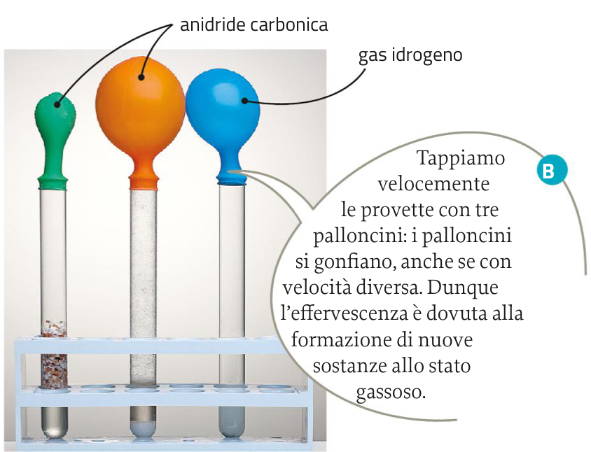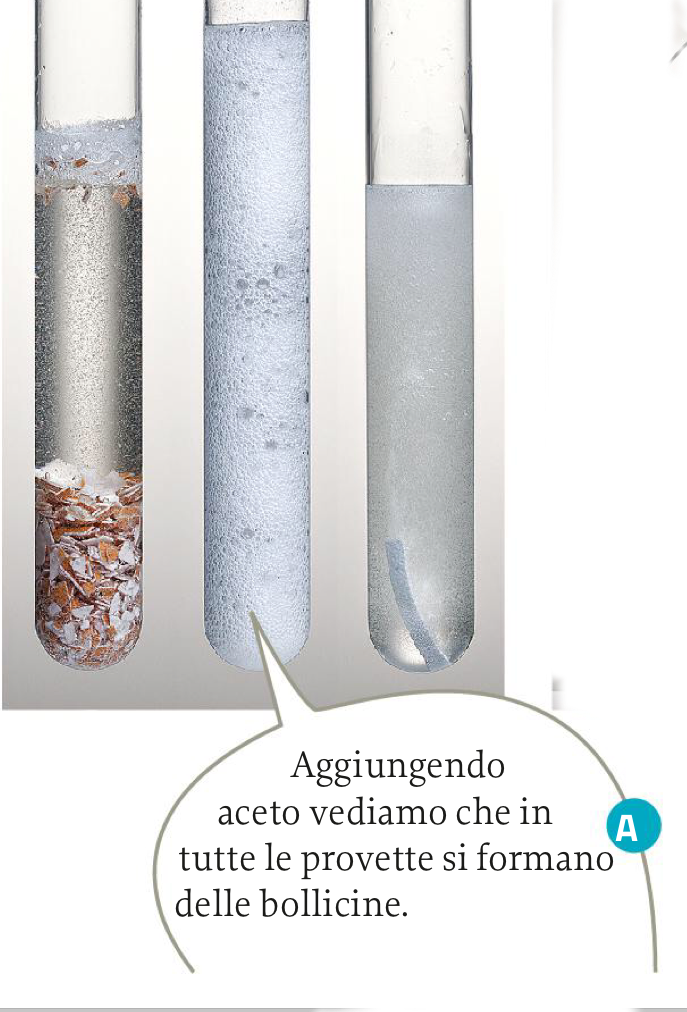 Mettiamo in una provetta del guscio d’uovo sbriciolato, in un’altra un cucchiaino di bicarbonato di sodio e in una terza un pezzetto di magnesio. Aggiungiamo in ogni provetta la stessa quantità di aceto; osserviamo la comparsa di un’efervescenza. Le bollicine indicano la formazione di un gas, che possiede caratteristiche e proprietà diferenti dalle sostanze che abbiamo mescolato. La comparsa di una nuova sostanza gassosa indica che è avvenuta una reazione chimica.