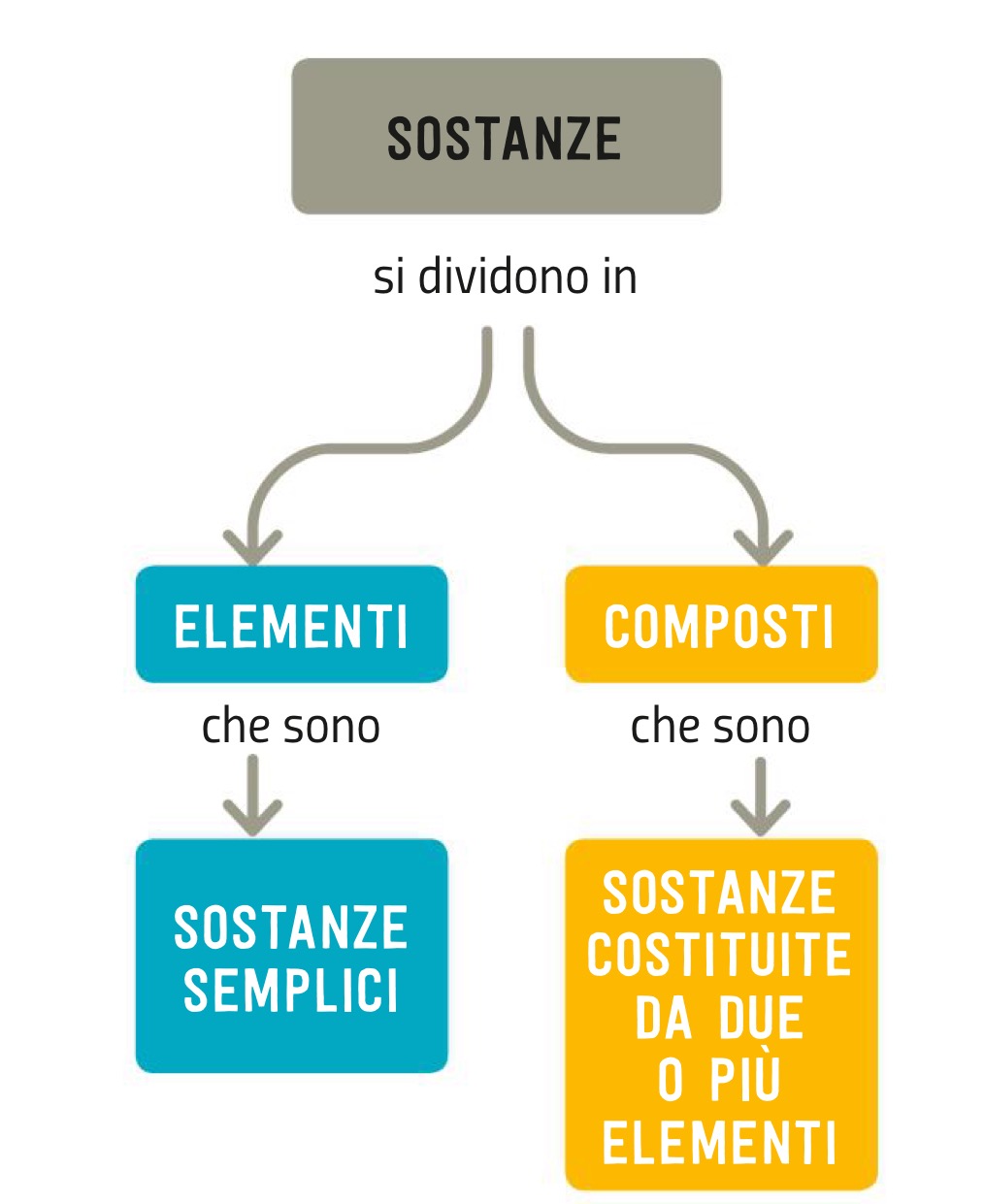 Per noi è normale considerare l’acqua una «sostanza fondamentale». L'acqua è costituita da due sostanze gassose. Con un semplice esperimento è possibile decomporre l’acqua in ossigeno e idrogeno gassosi. Tutte le sostanze che, come l’acqua, possono essere scomposte in altre sostanze più semplici attraverso una reazione chimica sono chiamate composti. Le sostanze che, come l’ossigeno e l’idrogeno, non possono più essere scomposte in sostanze più semplici sono gli elementi. Gli elementi hanno una caratteristica importante: possono unirsi tra loro per dare origine a numerosi composti, ma nelle comuni reazioni chimiche non possono trasformarsi l’uno nell’altro. Non è possibile, per esempio, trasformare l’ossigeno in idrogeno.