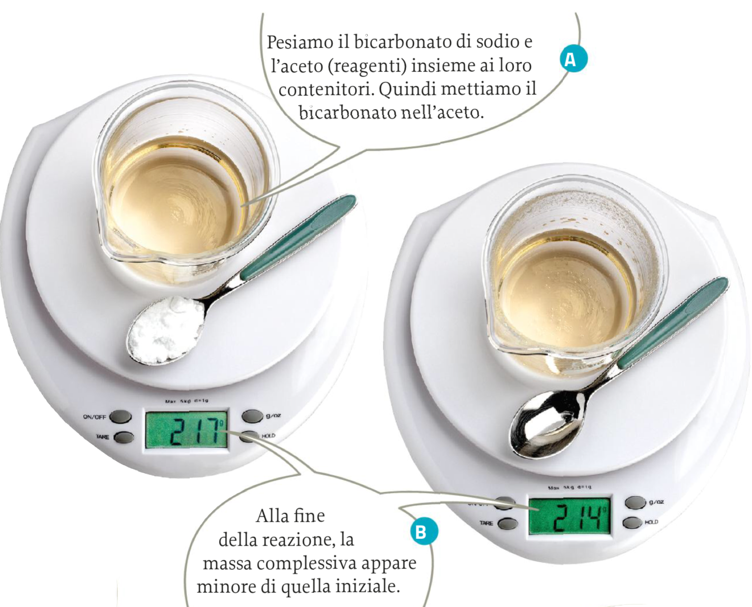 Osserviamo ancora una candela che brucia: noi diciamo comunemente che la candela «si consuma». Infatti nel tempo la quantità di cera diminuisce; ma dove è nita la cera? In una reazione chimica la materia scompare? Per dare risposta a questa domanda possiamomisurare lamassa deimateriali prima e dopo una reazione: prendiamo come esempio quella tra bicarbonato di sodio e aceto.