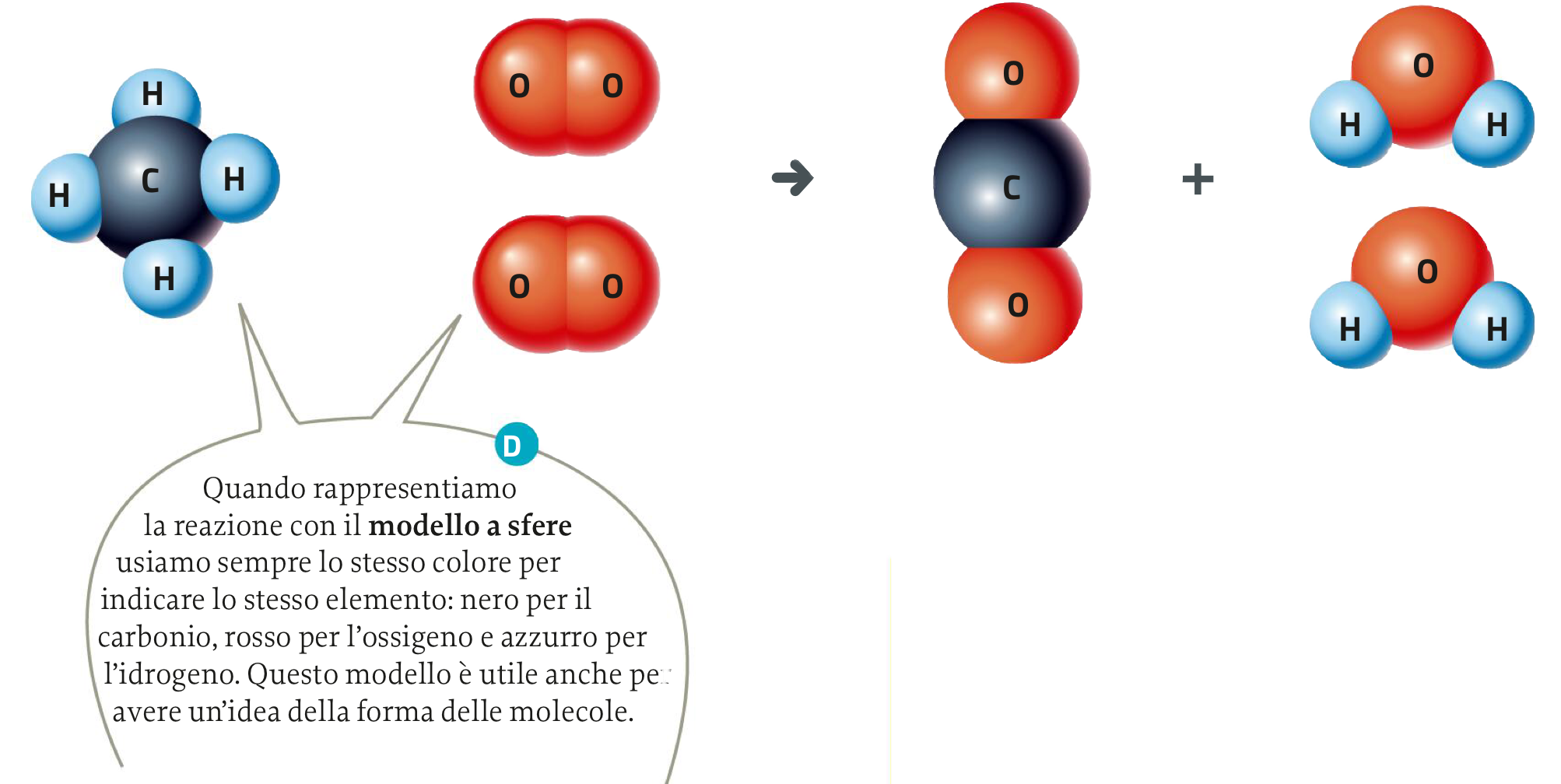 Consideriamo la reazione di combustione del metano e utilizziamo diversi linguaggi per rappresentarla. Il metano, che ha formula CH4, reagisce conle molecole di ossigeno presenti nell’aria producendo diossido di carbonio e acqua. I reagenti e i prodotti si possono indicare con il loro nome, oppure con la formula chimica, oppure ancora per mezzo di un modello a sfere. È importante contare gli atomi in modo da averne lo stesso numero sia nei reagenti sia nei prodotti: questo significa bilanciare la reazione.