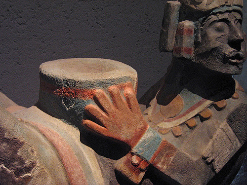 The second is that the chacmool was a cuauhxicalli to receive blood and human hearts; this use is particularly relevant to the Aztecs, who used a cuauhxicalli bowl in place of the usual disc-altar.