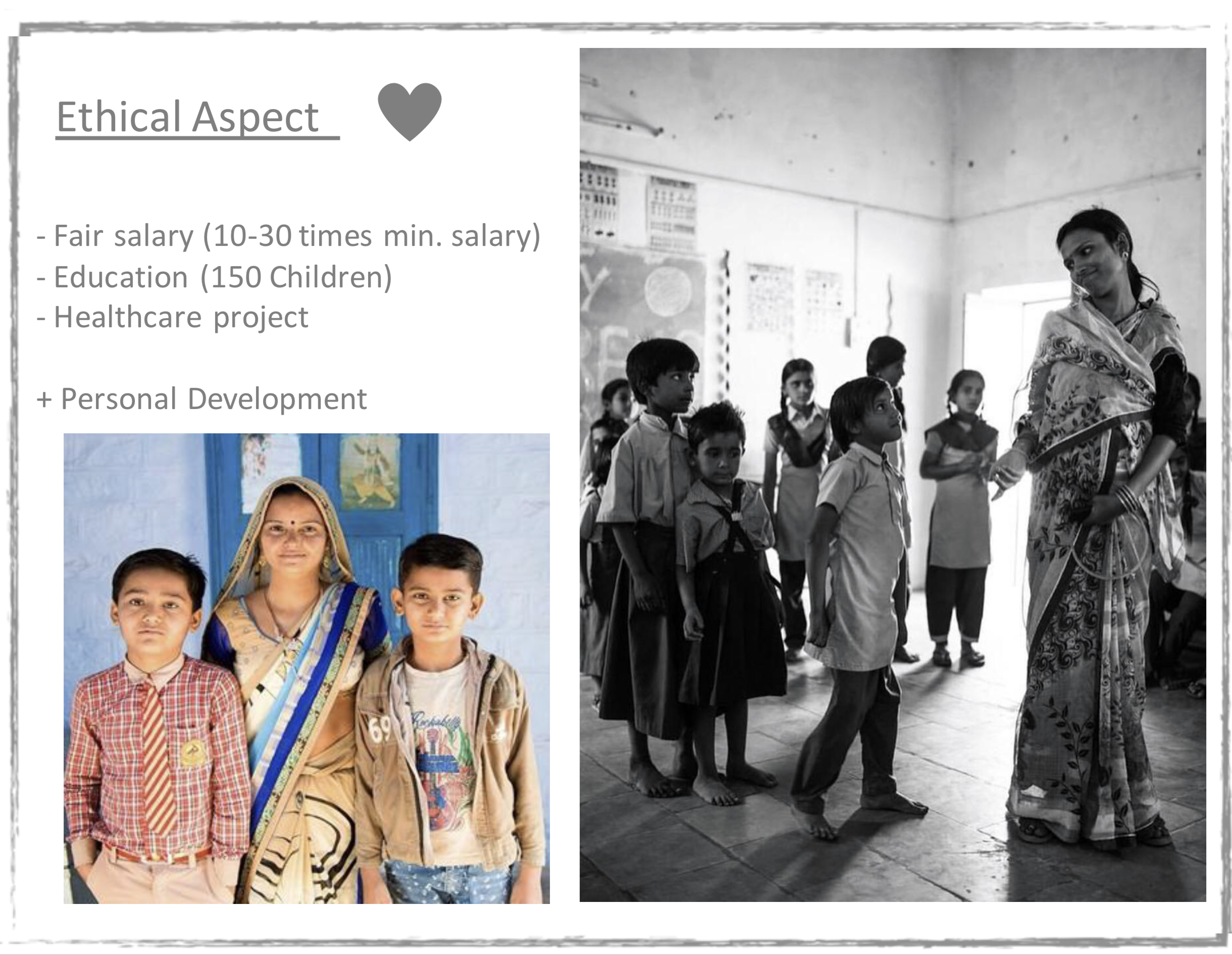 Si huet doropshin decidéiert hier eege Firma ze grënnen, déi an Indien op eng nohalteg Aart a Weis Kleeder produzéiert. Den Haaptaspekt vun hirer Aktivitéit huet si op Upcycling, Ethik an Transparenz geluecht. Iwwert dëse Wee stäerkt si d’Situatioun vun den indesche Fraen, déi oft ganz schwiereg ass.