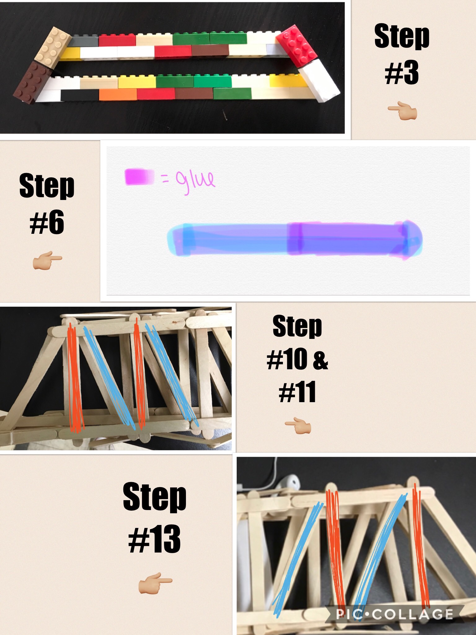 - Continue placing glue on the X's and placing them on the bridge until you have used 7 of your 15 sticks, or reached the other side of your bridge.