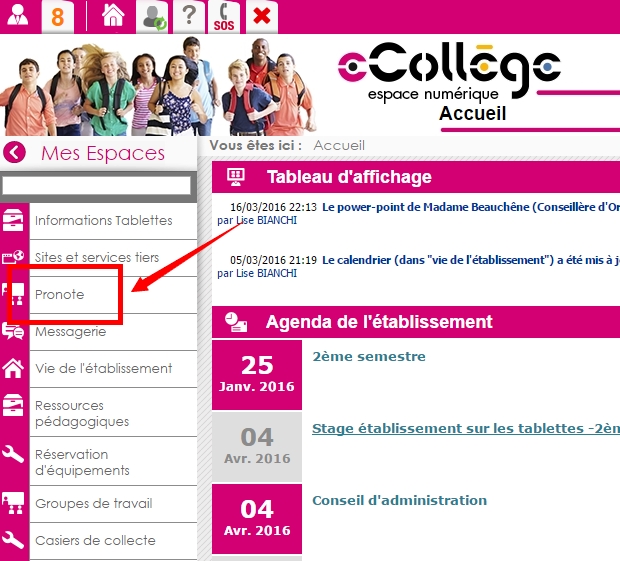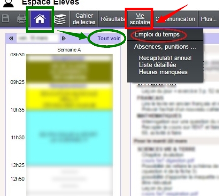 Il y a 2 façons de voir son emploi du temps : cliquer soit sur "Vie scolaire", soit sur "Accueil" (petite maison entourée) puis sur "Tout voir".