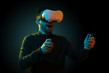 Criado com imagens de issaronow - "metaverse vr simulation gaming cyberpunk style, digital gamer streaming" • DIgilife - "Metaverse virtual event future game entertainment digital technology . Teenager having fun play VR virtual reality glasses sport game metaverse NFT game 3D cyber space futuristic neon background." • Gabriel Trujillo - "Man with VR headset working on laptop in metaverse" • AntonioDiaz - "Latin man feeling excited while experiencing virtual reality" • Nattapol_Sritongcom - "Abstract background architecture lines. modern architecture detail" • BullRun - "Professional financial experts collaborating during brainstorming meeting listening information from clever female director, businesswoman providing information to corporate workers of company"
