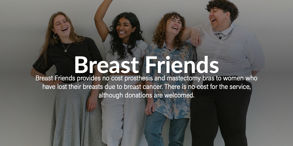 Breast Friends provides no cost prosthesis and mastectomy bras to women who have lost their breasts due to breast cancer. There is no cost for the service, although donations are welcomed.