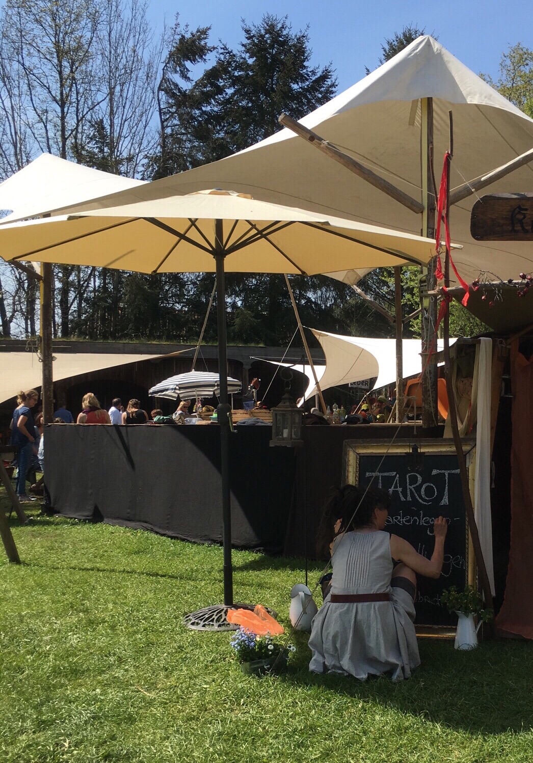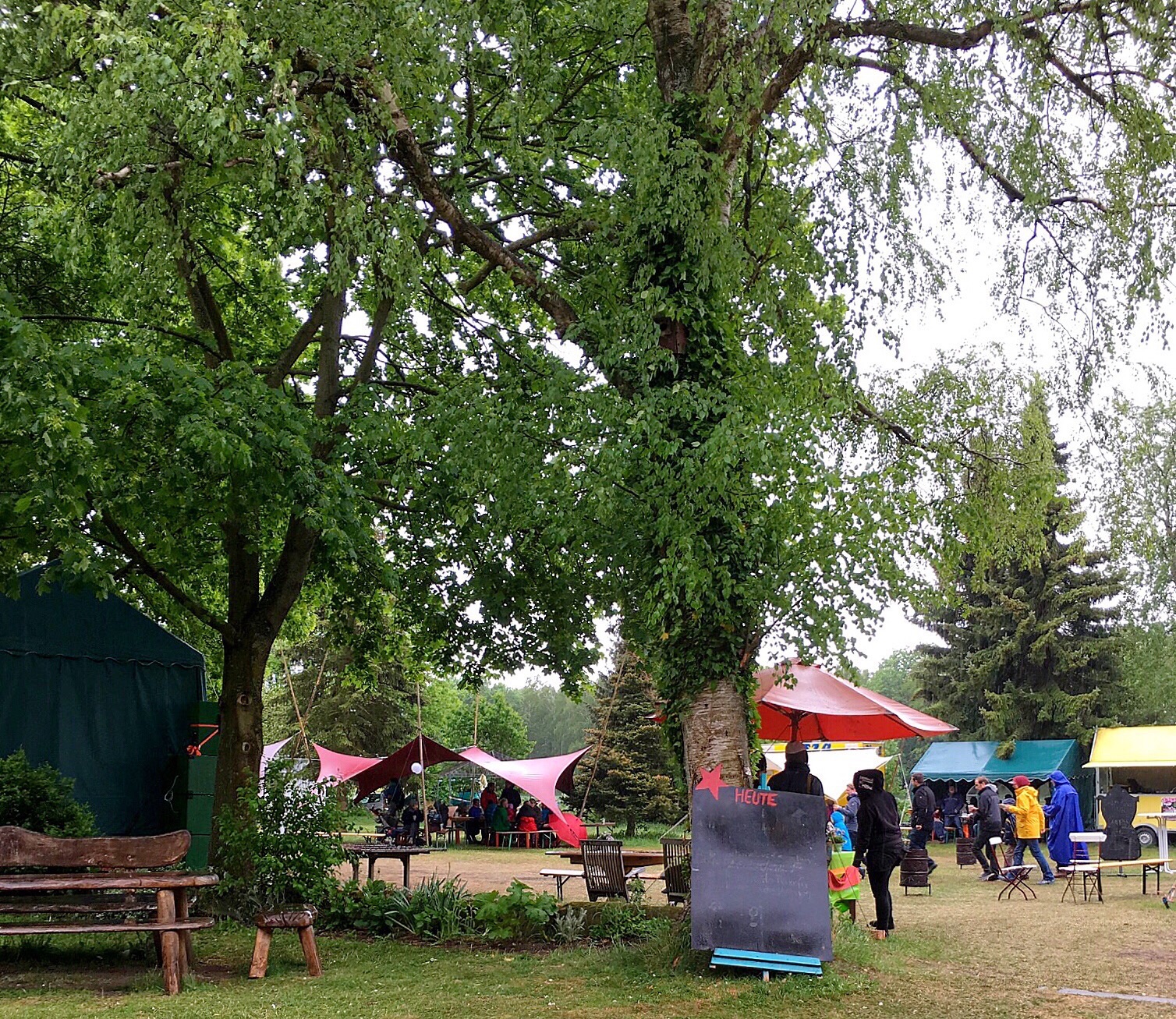 Johannes is eyeing the tent with some toys scattered about...and Olaf suggests a coffee. I readily accept because my aborted mission earlier has left me bereft of caffeine. Dagmar says she will visit the toilet and meet us at the coffee tent. Olaf asks Johannes if he would like to join us or play on his own. Then he receives instructions about how to find us if he needs to. We walk to the coffee bar (there is no line now) and look for a table that has a view of where Johannes is playing.