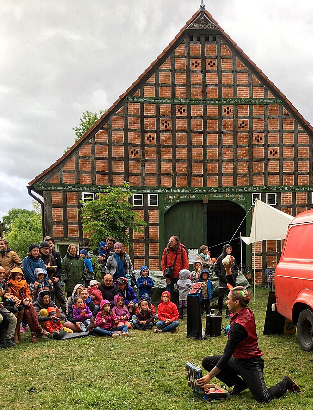 The performer is not too difficult to find...a big red truck in the center of town with a bunch of people standing by. His act is by no means polished...his music kept running out and he was having technical difficulties but I feel that added to the charm. The weather had turned quite ugly at this point and he asked if everyone wanted him to continue or stop. There was a resounding approval for his continuing with his act so in the middle of hail and wind is this lone performer and a crowd of children and adults braving the elements.