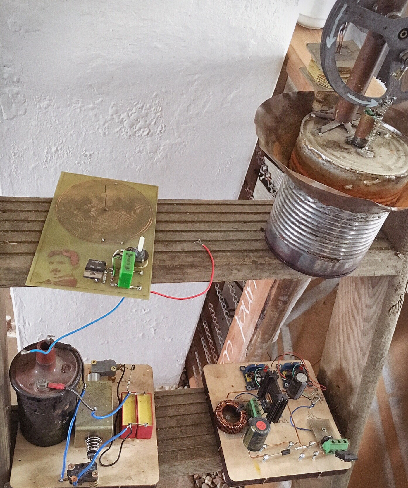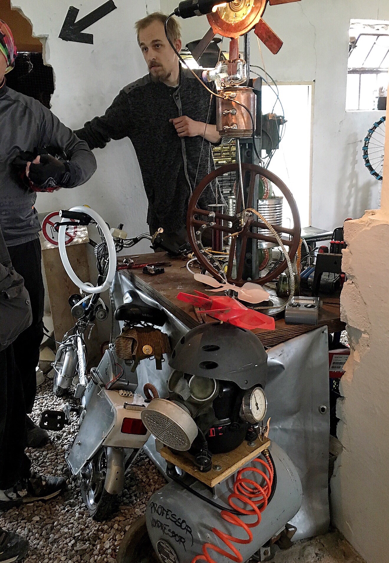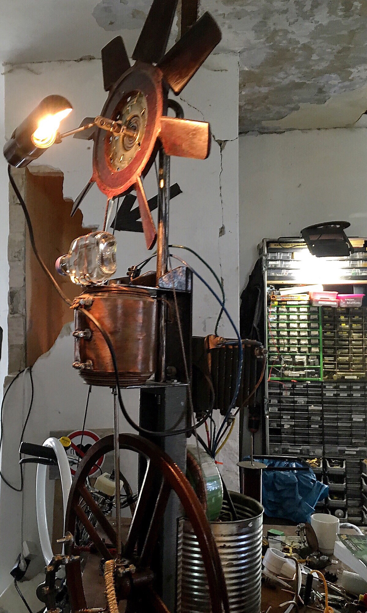 Oh, I see now. These are working pieces (lamps, fans, stuff) all made from found and discarded electronic parts like calculators and radios. Something like real working steampunk...but not as polished. I found it fascinating but difficult to get in to see for all men blocking the view.