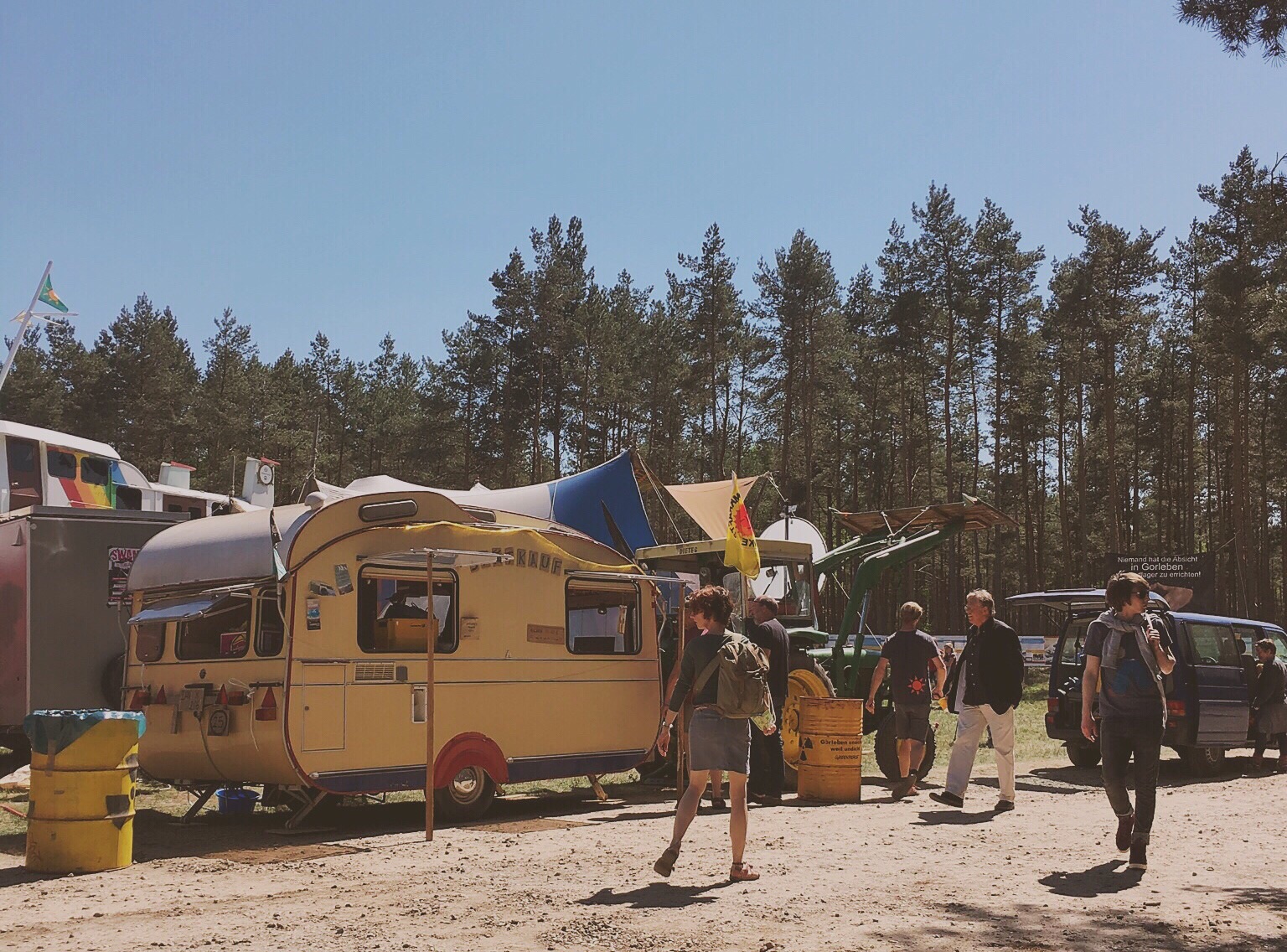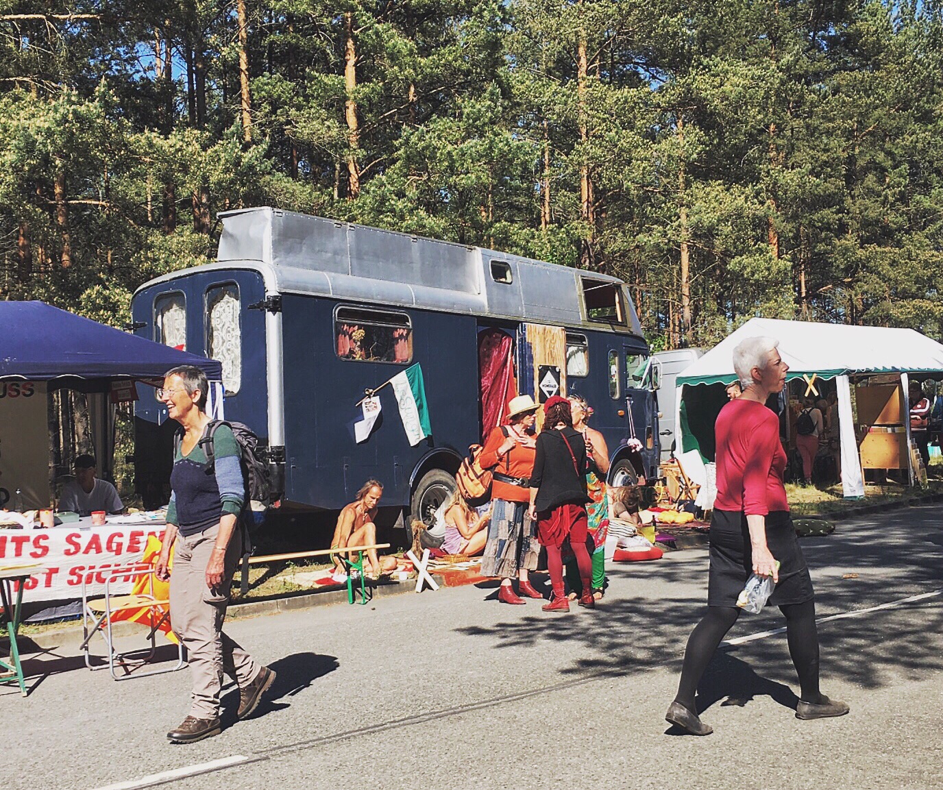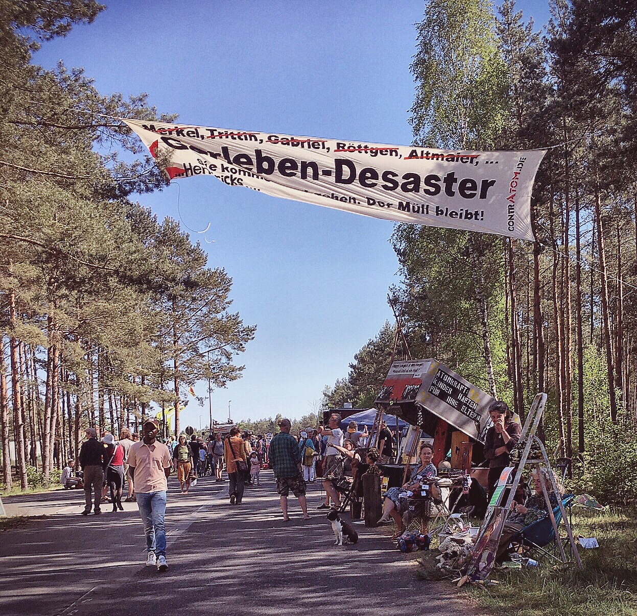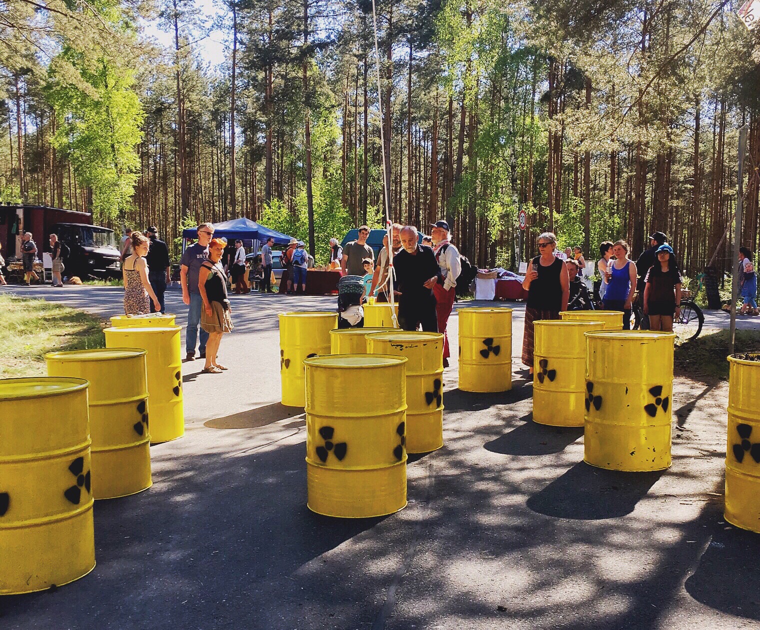 Olaf says he would like to meet me in Lüchow for lunch (he has a few errands to do before the afternoon in Gorleben). We have lunch at the restaurant across the street...along with food, I found the wifi. I need to stop here and tell you that Olaf's father has wifi. But, it likes to play hide and seek with me...and it is very good at hiding. I am told today that the cafe across the street will have a stronger signal from the router because of the router's location. Figures. At 12:30, Olaf says he needs to leave and suggests that I leave shortly to Gorleben to ensure a decent parking space. We part and I tell him I will see him in a few hours. I return to the flat, change shirts, add yet more sunscreen to any exposed body part, and head out. Once I get to Gorleben, I start the parking dance. I don't park at the end but, instead, drive a little farther until I find a spot that I feel is reasonably close. I park and follow the people already walking to the festivities. I am wondering how far I will have to walk as I follow the line of people into the woods...oh! I am here! Well, that was quick...