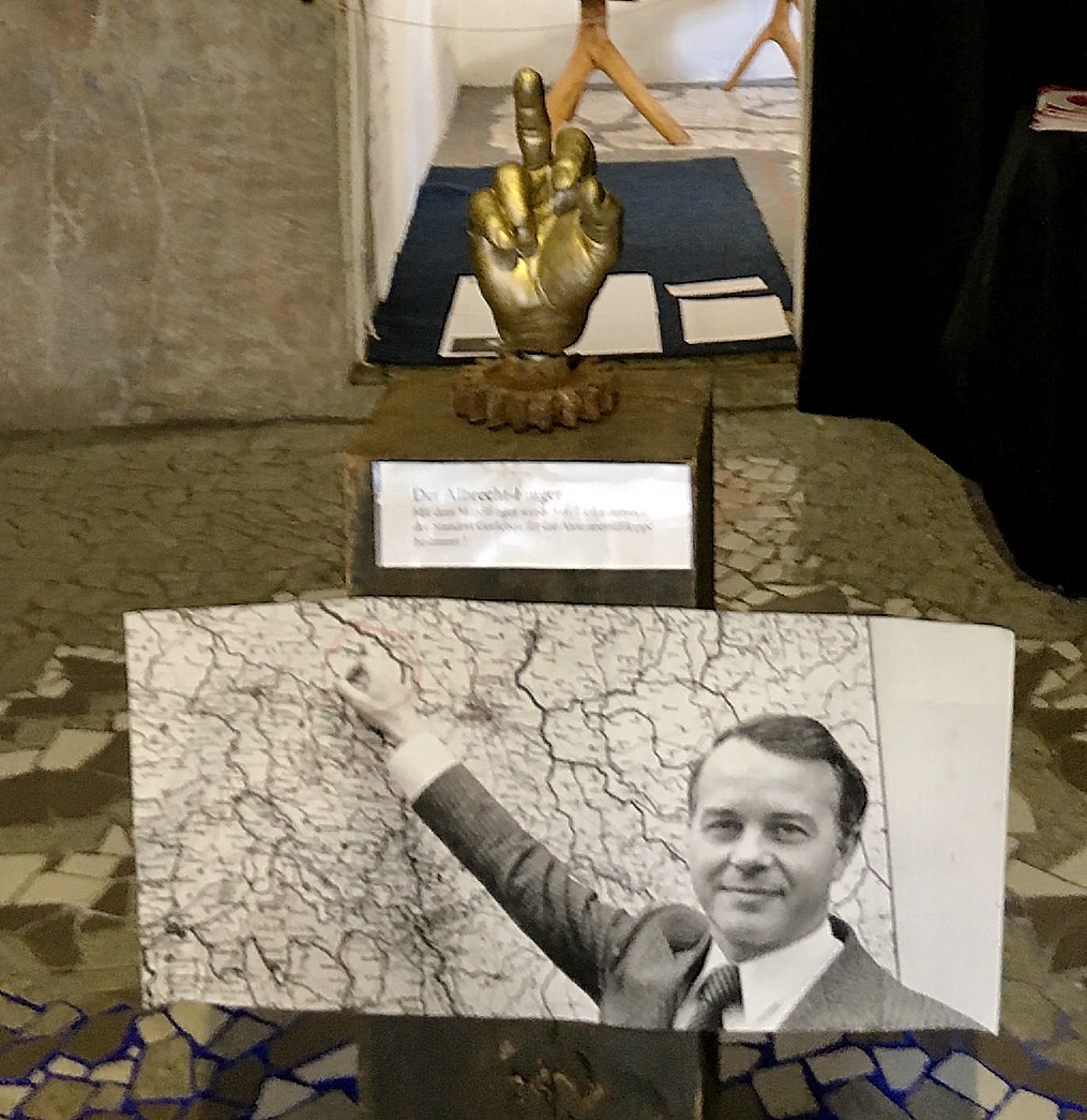 The best I could figure was that this statue is a salute (of a sort) to the way the site for the nuclear waste storage was pinpointed on a map.