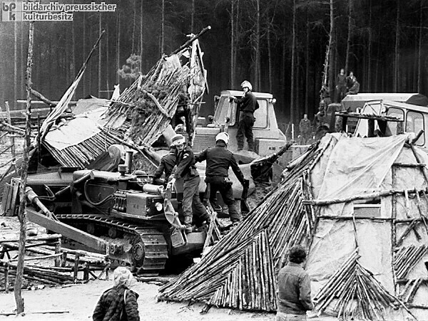 Gorleben has become famous because of plans to build a national repository for Germany's radioactive waste there. A protest camp, The Free Republic of Wendland, was established in May 1980 by a group protesting against the establishment of a nuclear waste dump at the location. During the 33 day occupation, Radio Free Wendland began a pirate radio broadcast from a tower at the occupation site and residents of the surrounding region supported the occupation with food and wood and water was piped in by a wind-powered well and warmed with solar power. The site was cleared of its inhabitants by the Lower Saxony police and the Federal Border Guard on June 4, 1980.