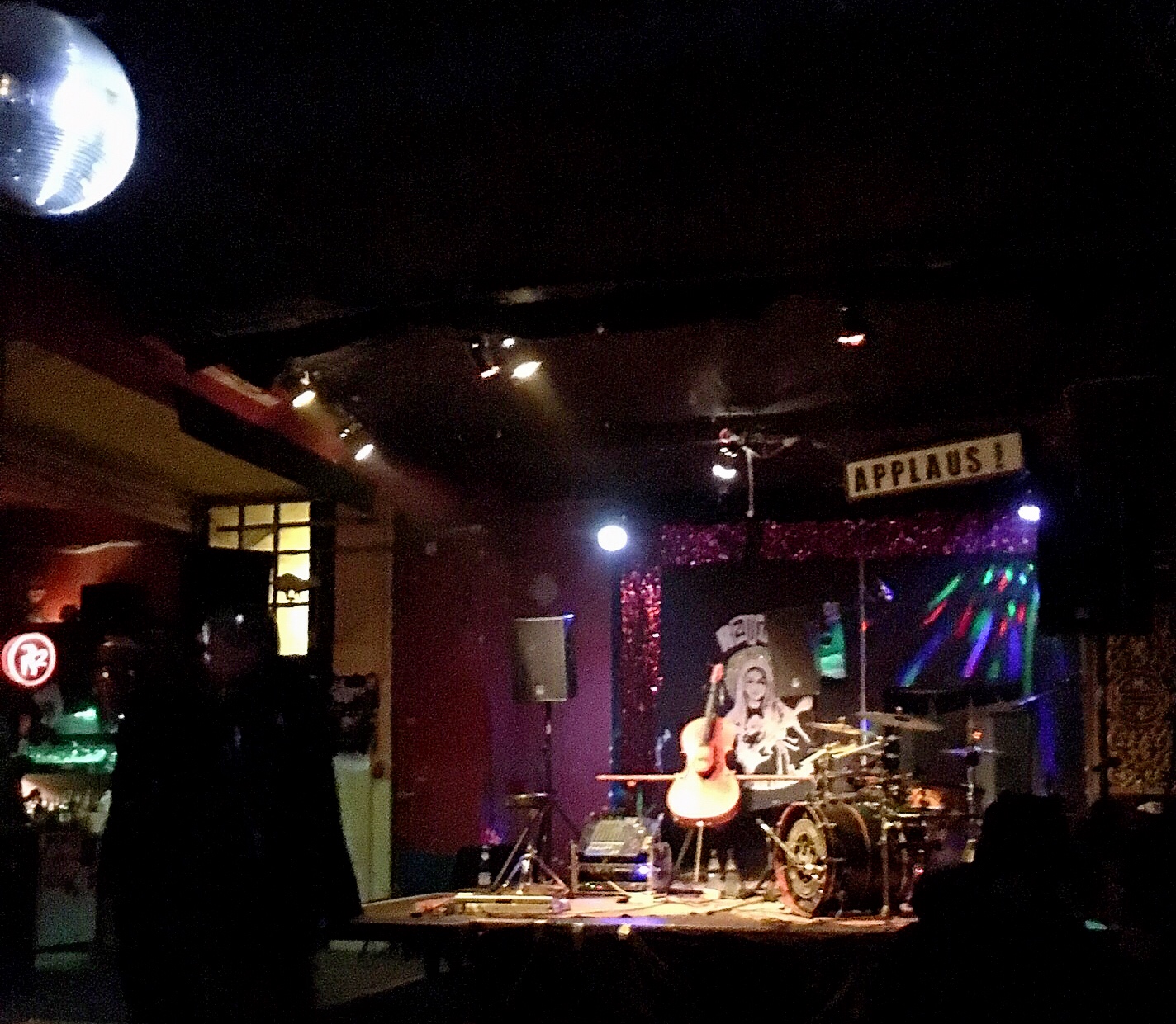 Some hours later, after a nap and with a full belly, I receive a text from Olaf to meet him in Neu Tramm. I get bundled up (it was quite cold today) and drive to the venue. Olaf is already there and we move up to Raum 2 where the band will be playing. We are early so we grab a drink and find a good location. The band is "Guts Pie Earshot" - a duo of an electric cello and drums.