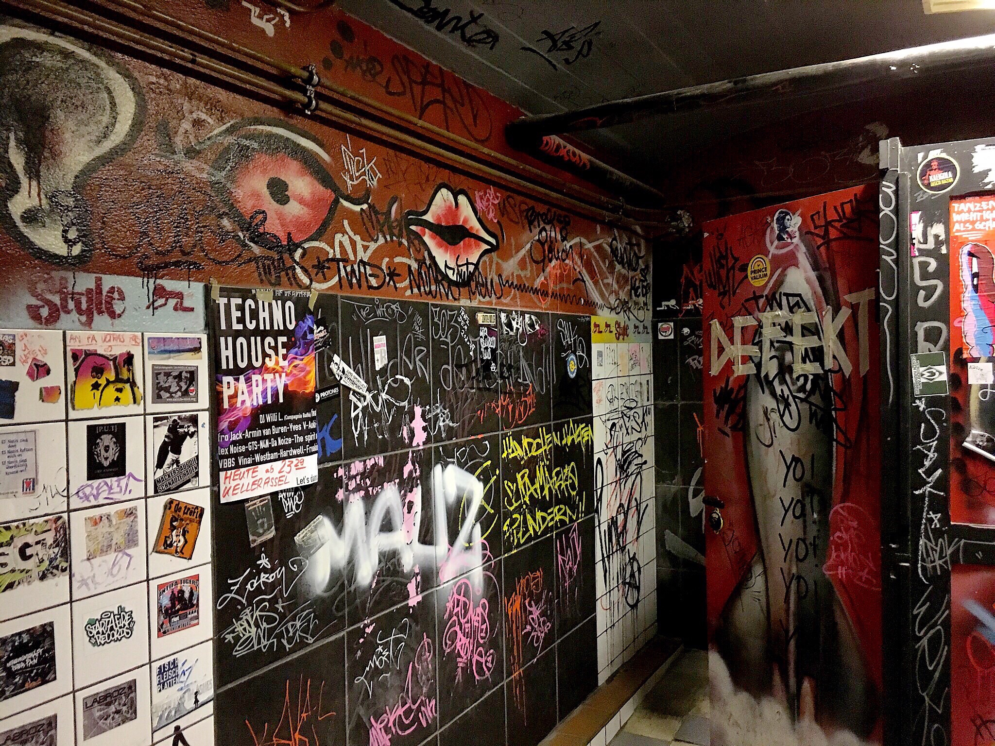 The music is a mix of 80's alternative, some Prince, some Bowie, some 60's soul, and some 70's funk. We watch the dancers while sipping on vodkalemons. At Lina's, on Tuesday, Olaf had been talking about the bathrooms at Raum 2 (where most of the concerts are held). I don't recall ever being in the bathrooms here...he says it is something I have to see. I am not quite sure what to expect...