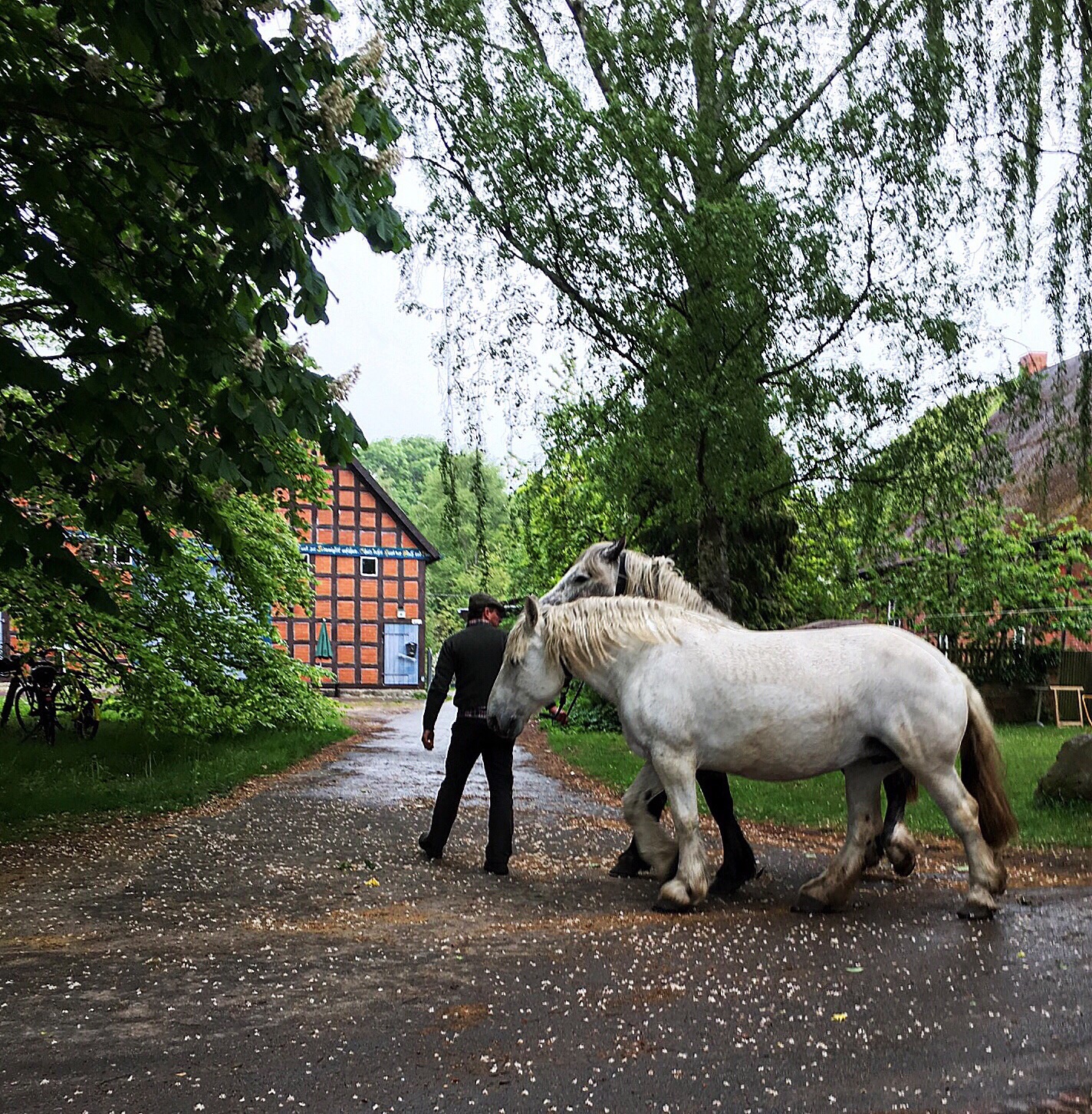 I don't know if he shortened his act some because of the inclement weather but, eventually, he sheepishly asked for hat cash (as do many of the performers at the KLP) and the parents give the children a coin or two to put into his hat. I drop in two Euros and on my way out I pass these two elegant Percheron horses coming off the trailer (I think they were at a different KLP site)...I miss my horse.