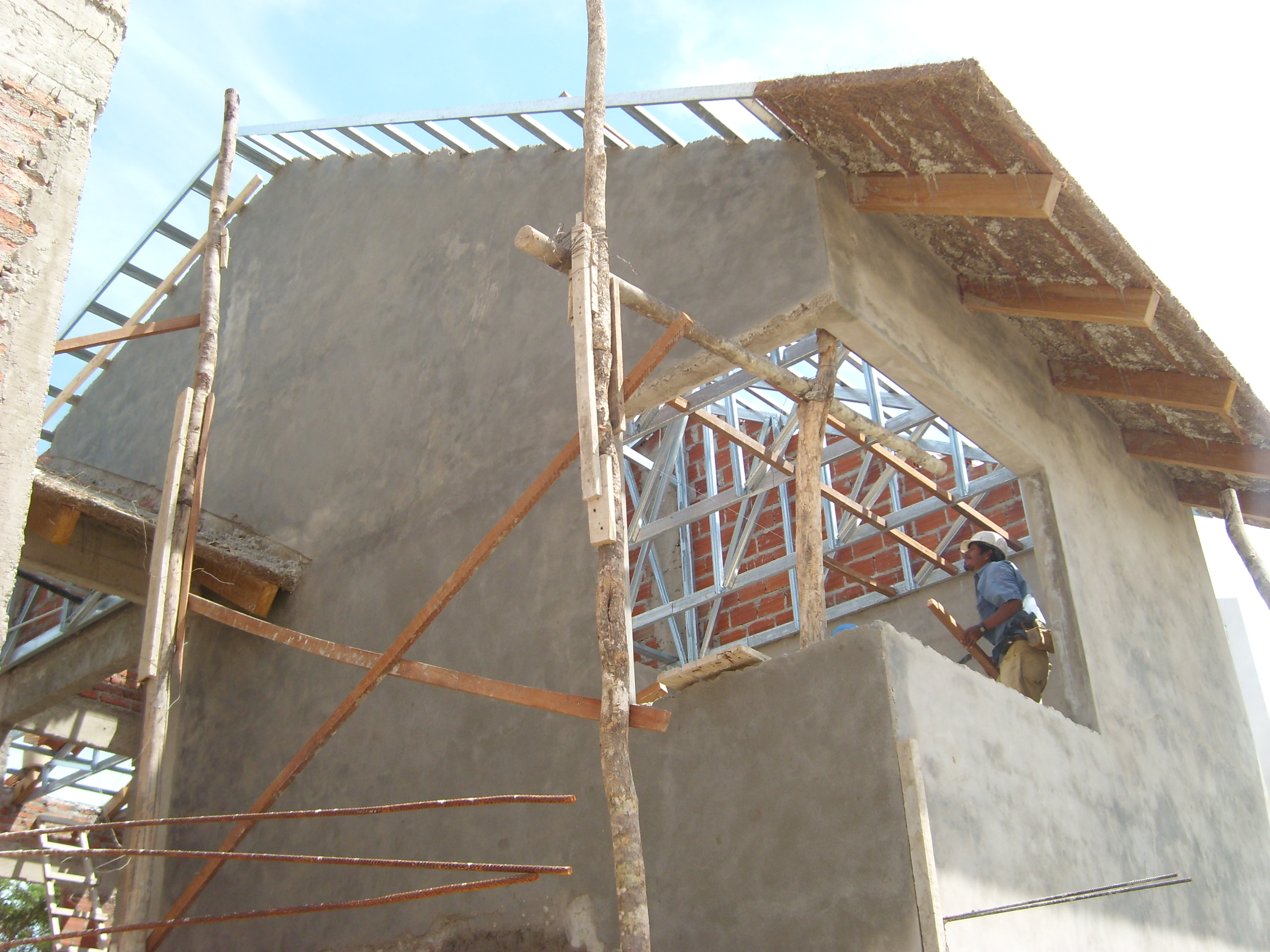 Foto: Armado de cercha con sobre base de encadenado de hormigón.