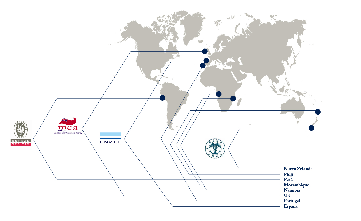 Trabajamos de forma habitual con la Dirección General de la Marina Mercante en España, la Agencia Marítima y de Guardacostas (MCA) del Reino Unido y las principales sociedades de clasificación (RINA, BV o GL, entre otras).