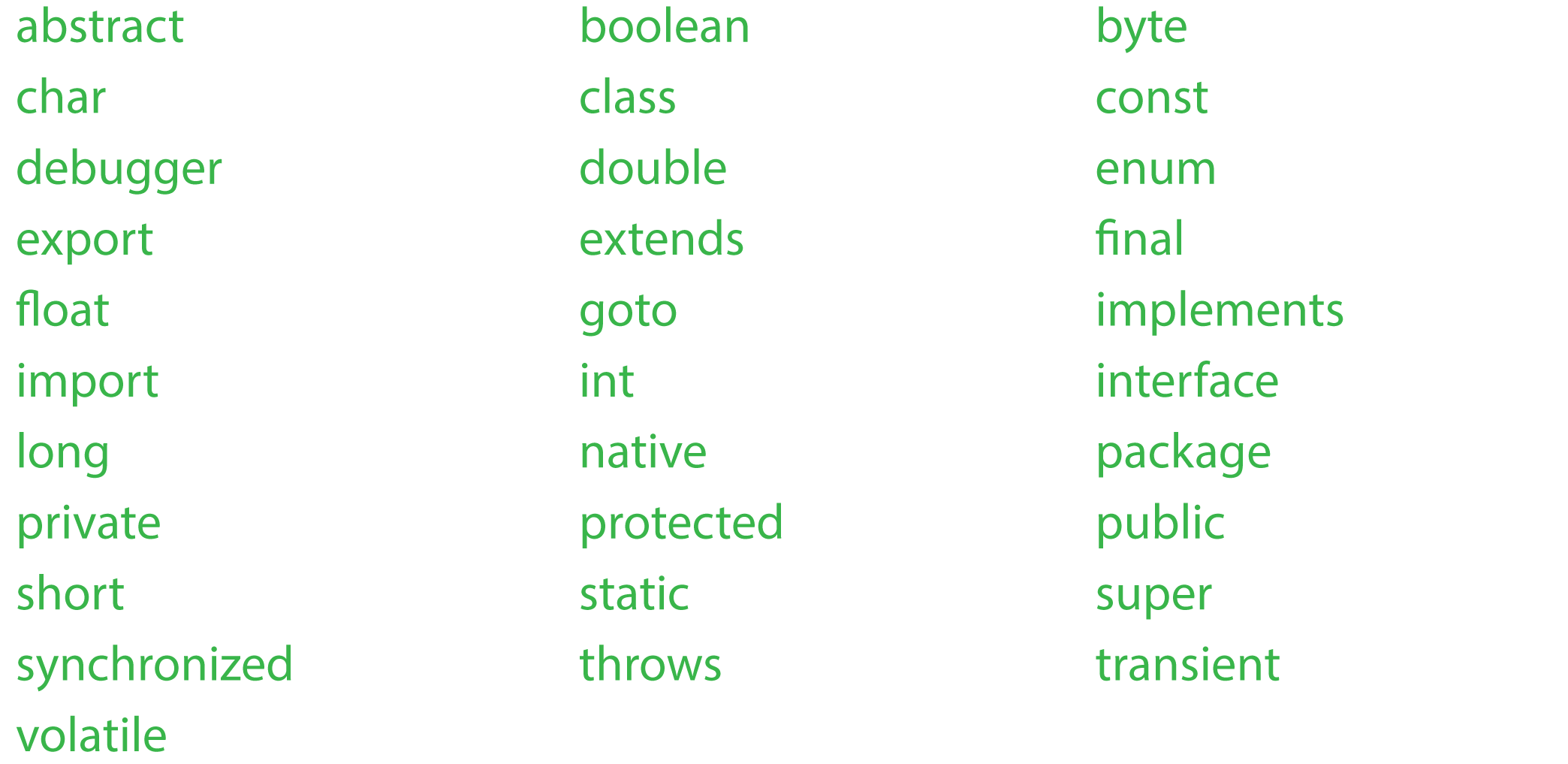 The following lists the reserved words for future keywords by the ECMAScript specification: