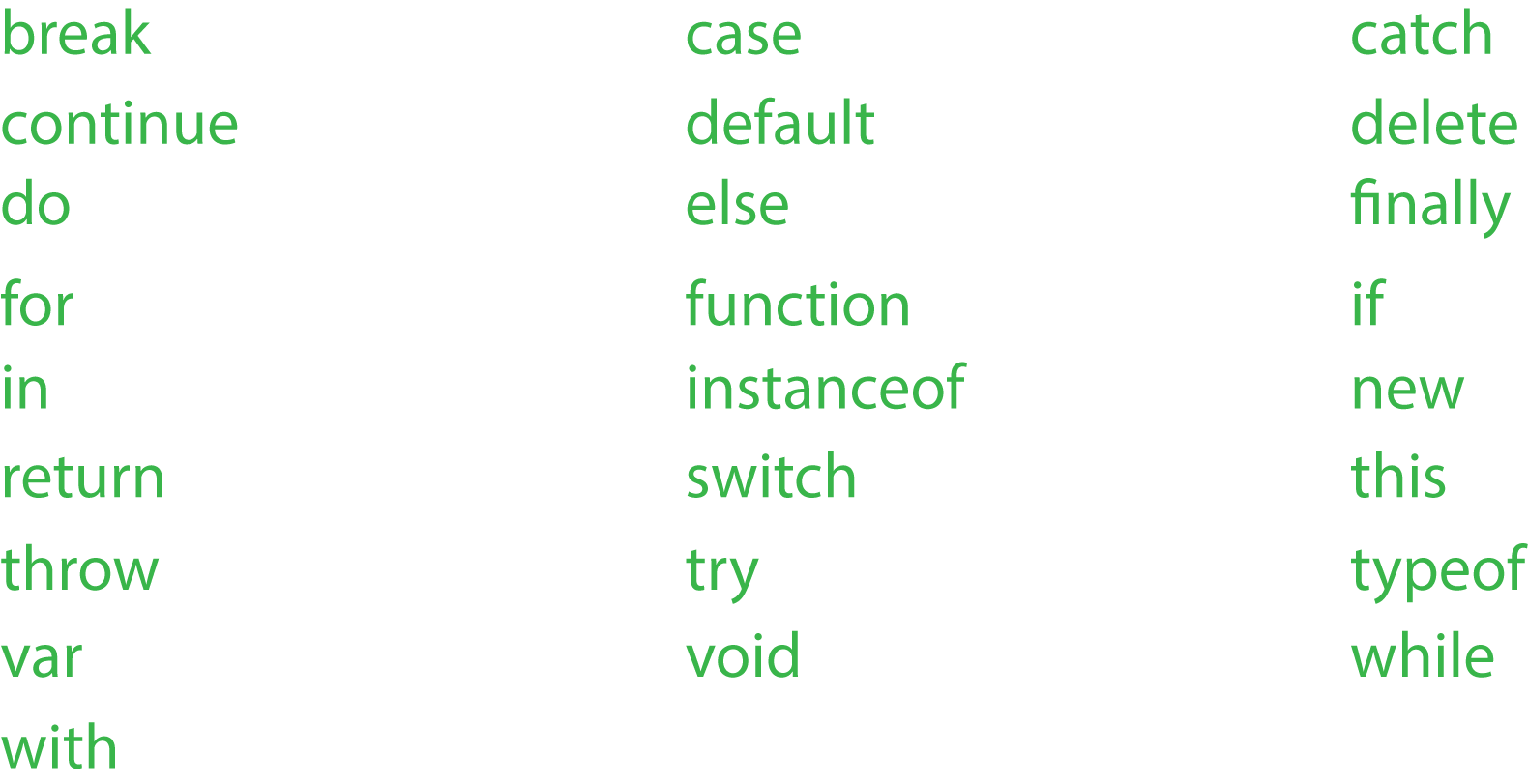 JavaScript reserves certain words for specific uses. The following lists the JavaScript reserved words: