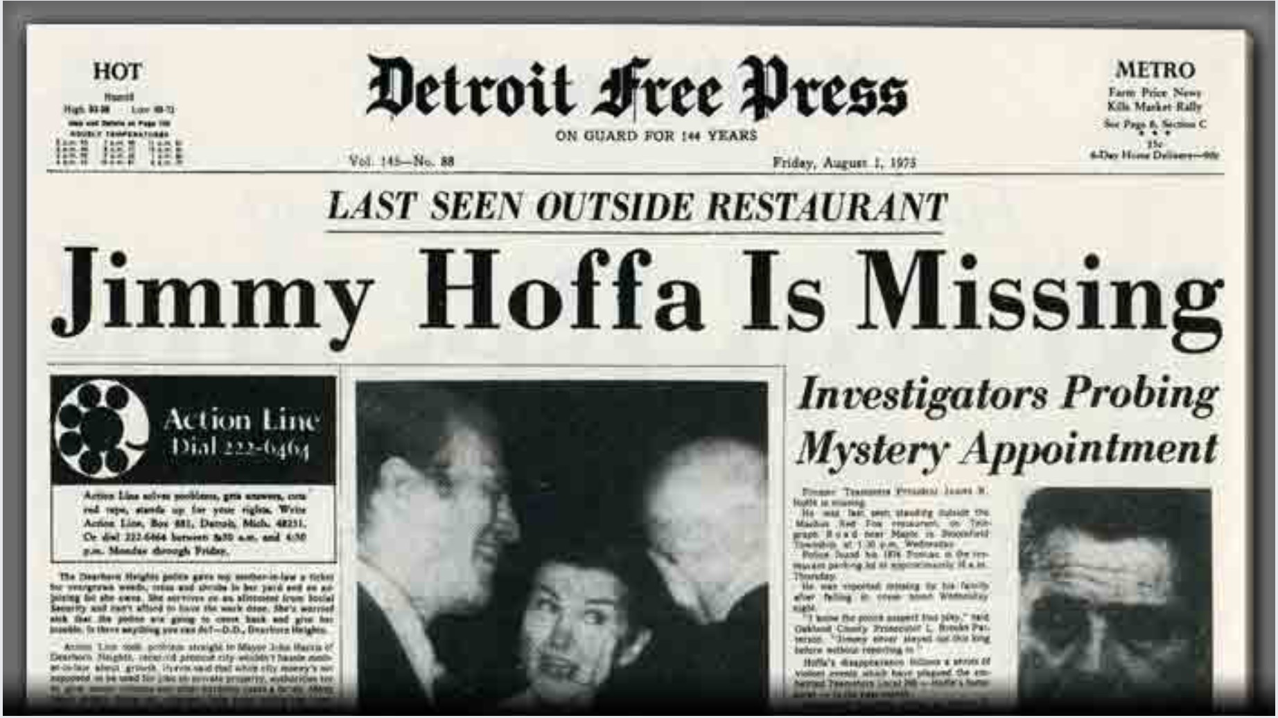 Jimmy Hoffa became a labor organizer in the 1930s, rising in the Teamsters Union during the next two decades. He played a key role in forging the first national freight-hauling agreement. He was sent to prison in 1967 for jury tampering, fraud and conspiracy. In 1975 he disappeared; he is believed to have been murdered.