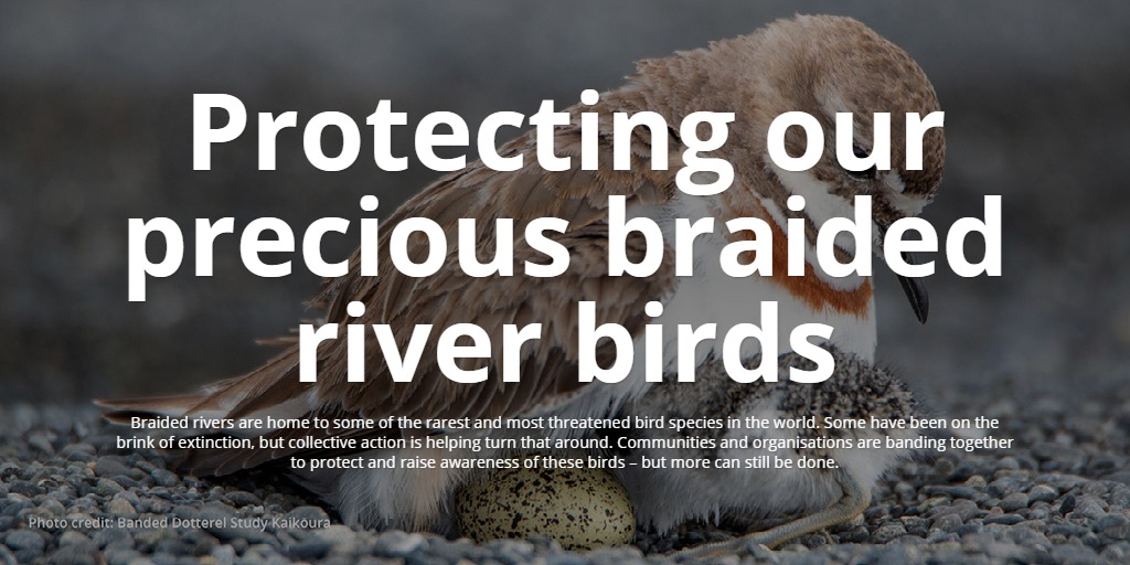 Protecting our precious braided river birds Braided rivers are home to some of the rarest and most threatened bird species in the world. Some have been on the brink of extinction, but collective action is helping turn that around. Communities and organisations are banding together to protect and raise awareness of these birds – but more can still be done.