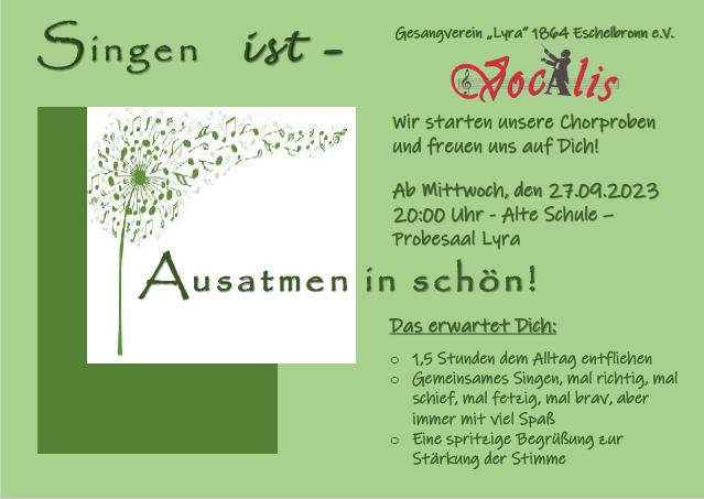 Wir freuen uns auf Dich zur Chorprobe – ab Mittwoch, dem 27.09.23, 20:00 Uhr, Alte Schule, Schulstraße, Probesaal Lyra im Obergeschoss Kontakt: Ursula Nussko, Im Erpfel 2, Eschelbronn, Tel. 06226/40713
