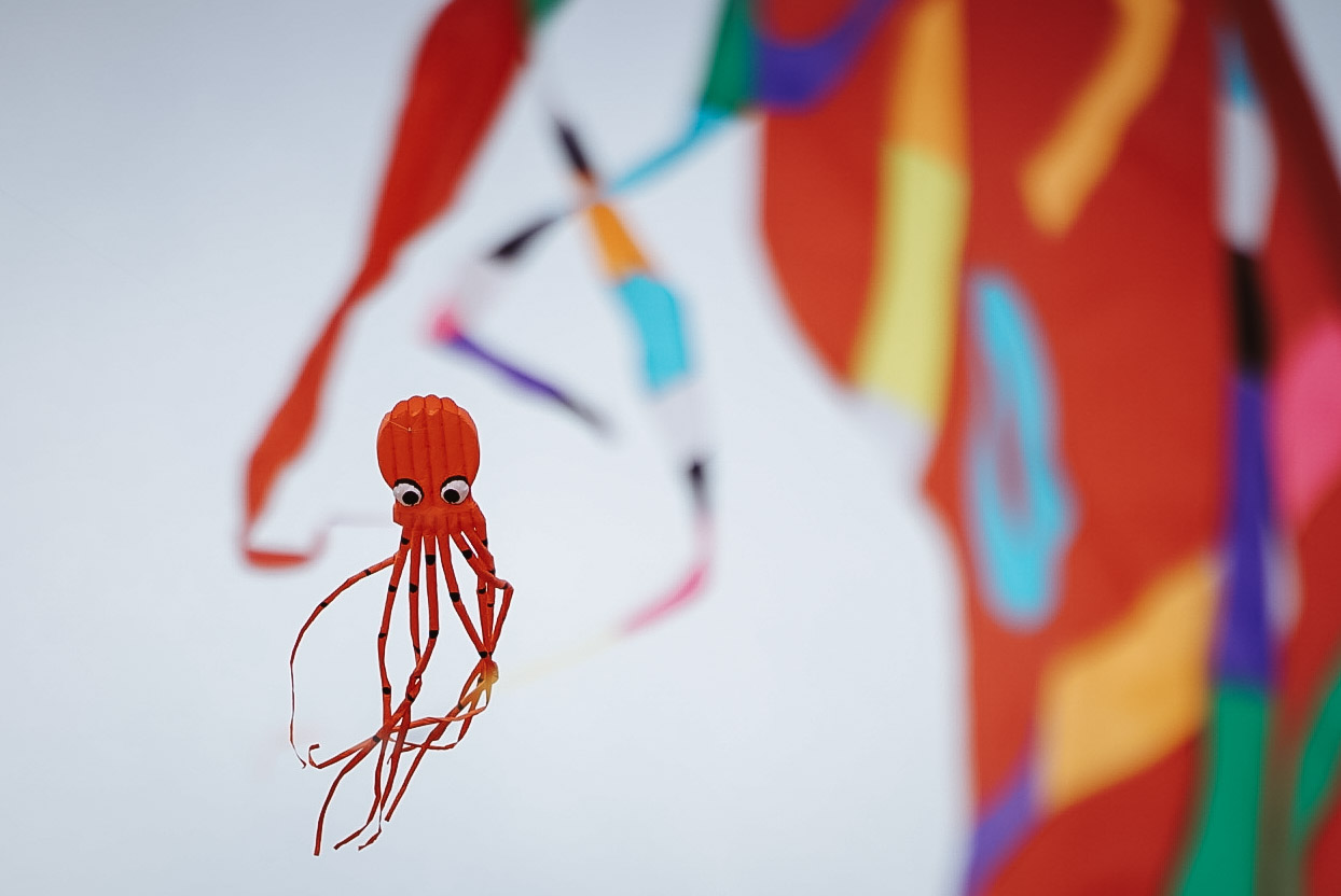 … üblich auch der weitere Verlauf: Drachen 1 fliegt nicht, Drachen 2 landet im Meer, Drachen 3 hat verknotete Schnüre, bevor er einmal in der Luft war, Papa läuft fluchend über den Strand. Drachen 2 trocknet, Drachen 3 war zumindest einmal in der Luft, auch Drachen 1 (ein 8 m Oktopus) landet nach kurzem Flug im Meer. Als Papa den Oktopus mit seinen klitschnassen, schweren Tentakeln aus der Nordsee hievt, sah ich im Geiste Will Smith in Independence Day vor mir, den Außerirdischen wüst beschimpfend hinter sich durch die Wüste schleppend. Alles wie immer!