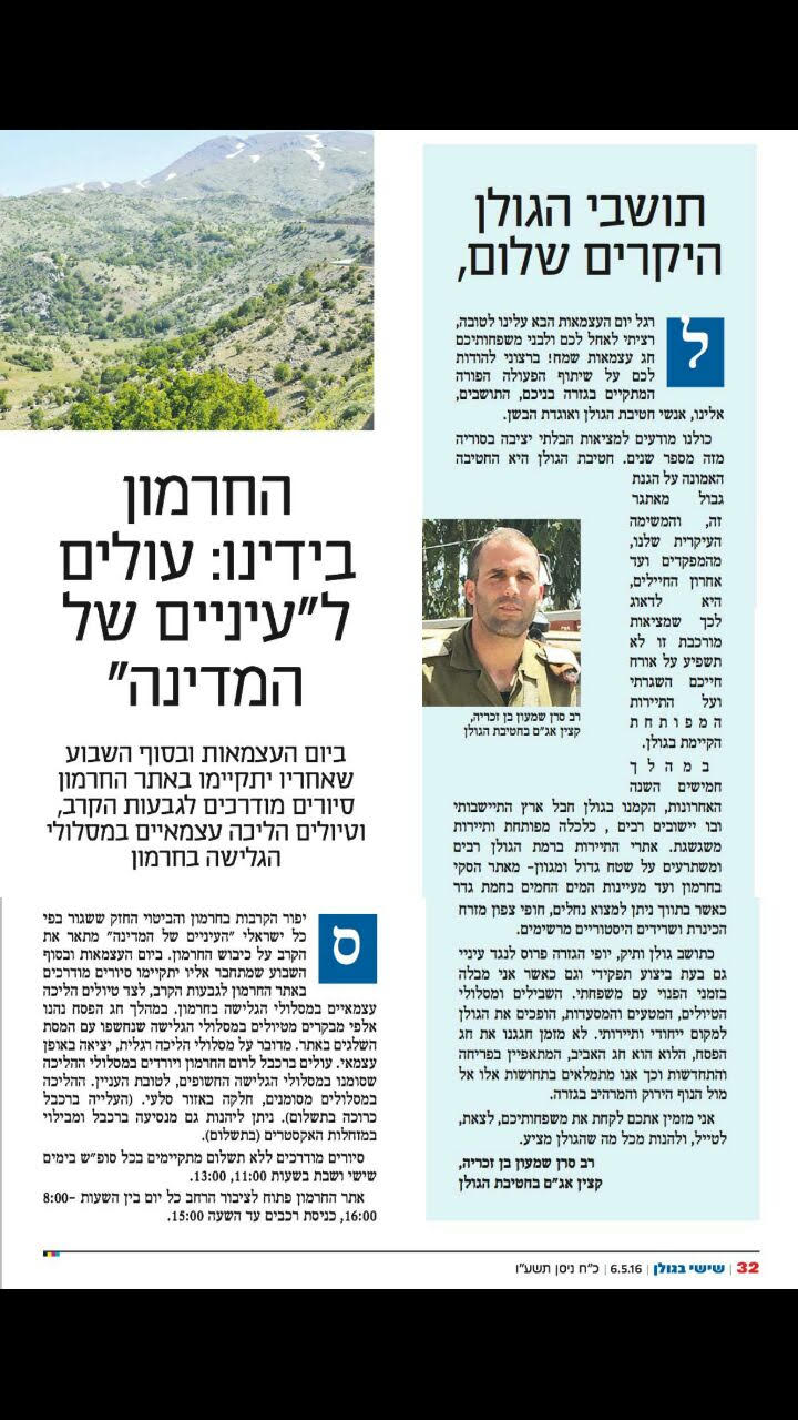 "התפקיד שלי זה להיות מודאג", מסכם אבנעים. "אני נערך להתפתחות שהיא לא שלום, אבל אני מאוד מקווה שיתפתח משהו אחר. כך או כך, אפשר לטייל ברמת הגולן".