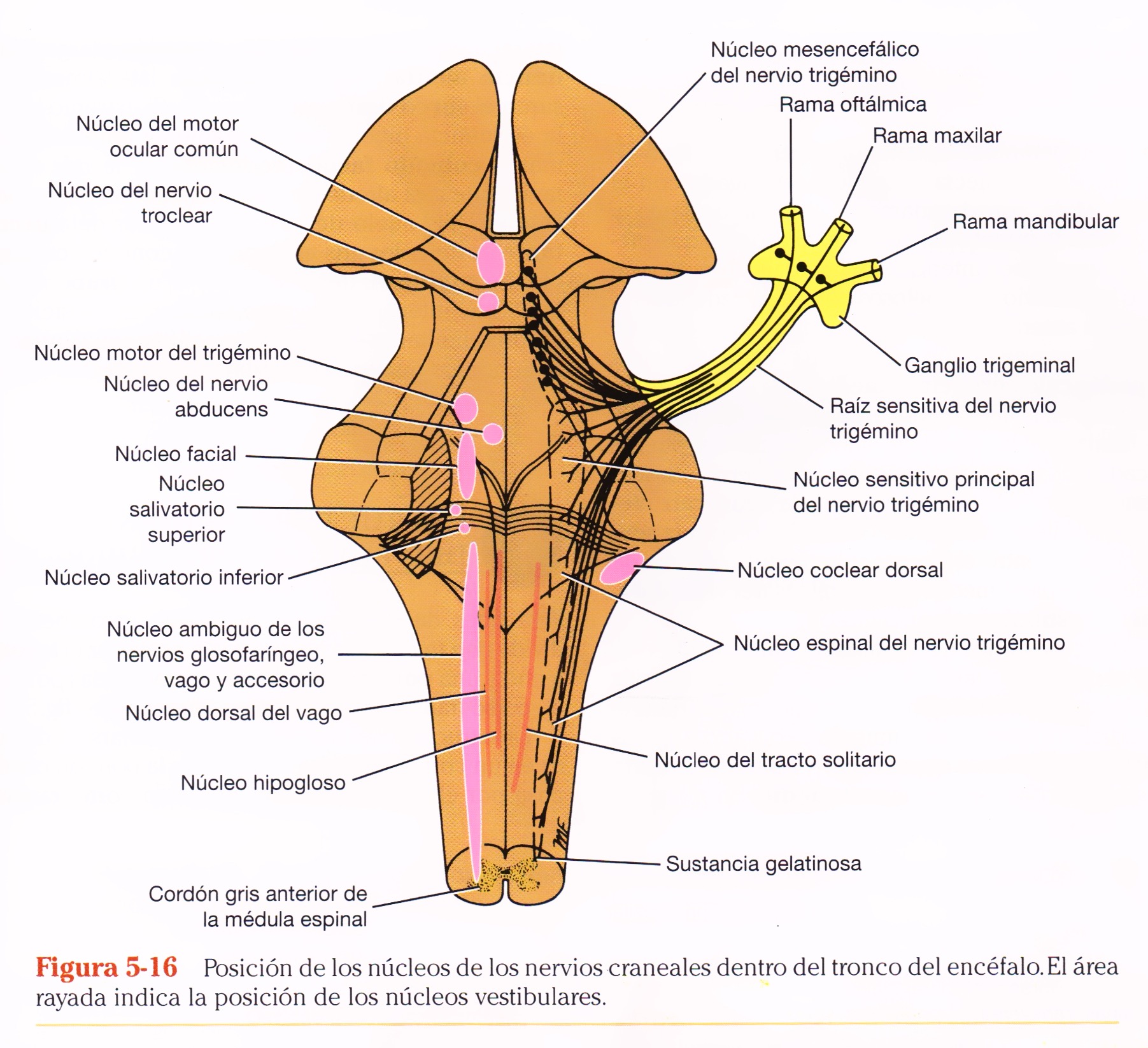 Un corte transversal a través de las olivas muestra el complejo nuclear olivar, los núcleos vestibulococleares, el núcleo ambiguo y la sustancia gris central.