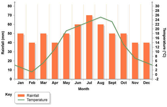 Temperate Deciduous Forests are usually very wet in general. They have 4 distinct seasons. The winters are cold, the springs are wet, the summers are warm, and the fall is moderate.