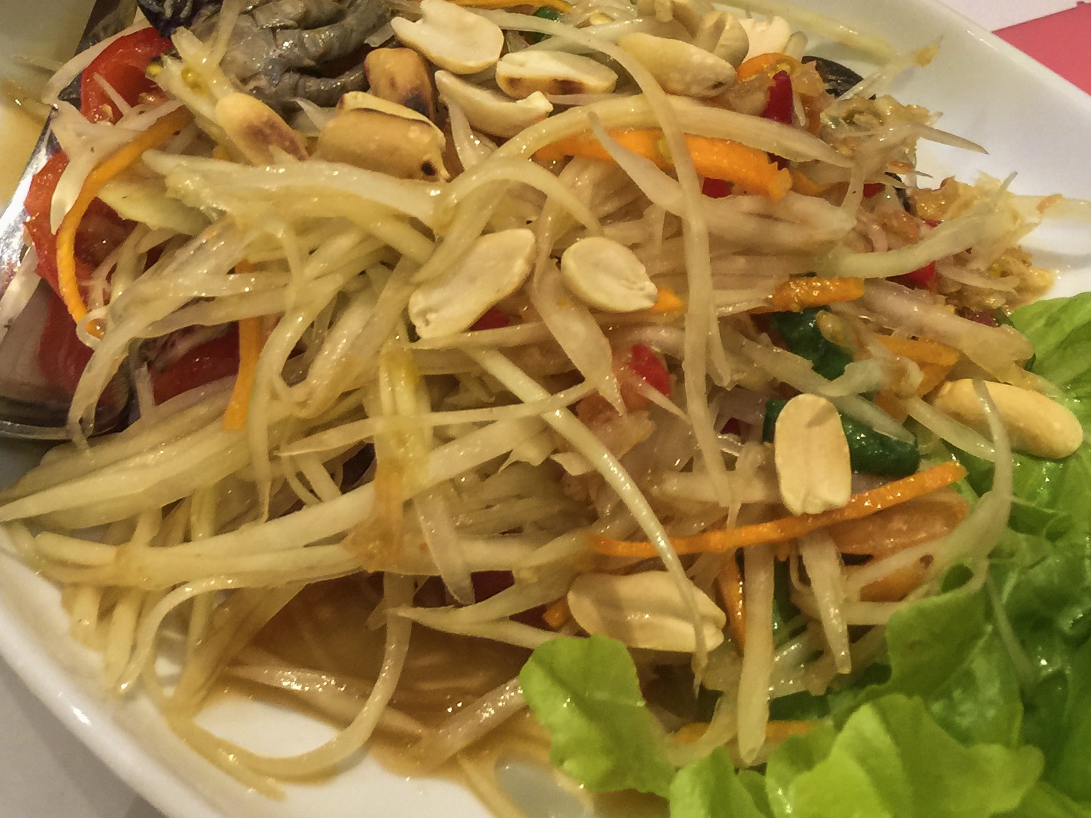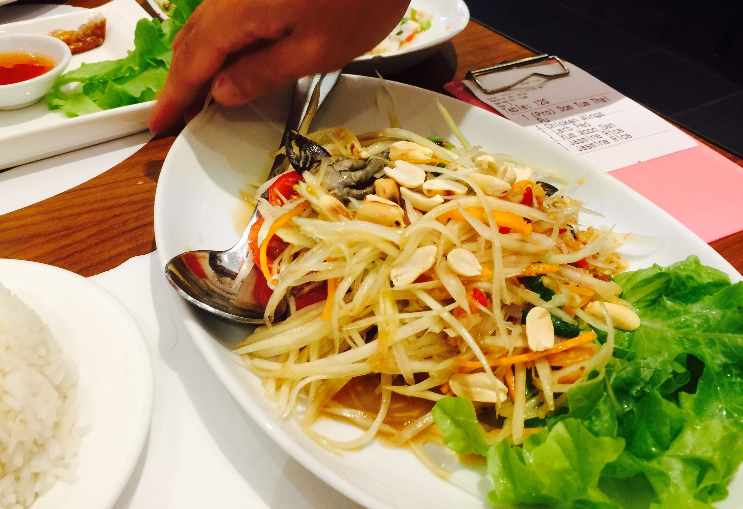 อาหารโปรดของฉัน หน้าตาแบบนี้ ส้มตำไทยใส่ปู แต่สิ่งที่พลาดครั้งนี้ คือ ฉันลืมสั่ง ข้าวเหนียว อาหารหลักของฉันเลยนะ รสชาติ เปรี้ยว หวาน แต่ไม่เผ็ดมาก ถ้าใครชอบเผ็ด ต้องบอกพนักงานเลยนะค่ะ เพราะคนไทยส่วนใหญ่ ชอบอาหารรสชาติเผ็ด อาหารร้านนี้ รสชาติกลางกลางดีค่ะ ถ้าถามดิฉัน เป็นคนไม่ทานรสชาติจัดมาก ก็บอกว่า ชอบนะค่ะ