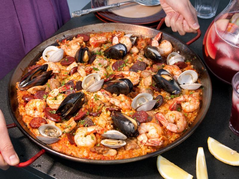 Paella es un comida de Valencia. Voy a comer paella para cena. Paella es un plato de los mariscos y el arroz. No puedo esperar para comer está comida para cena.
