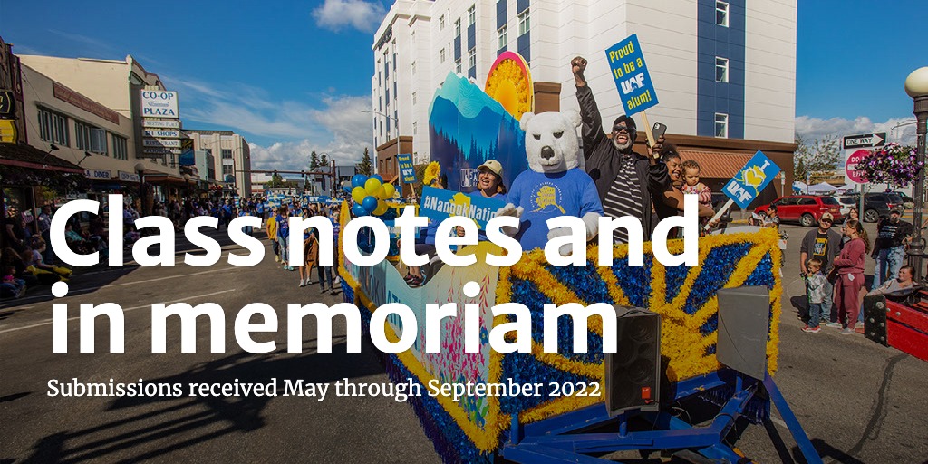 Above: Nook is flanked by alumni Ray Alda ’21, left, and Darryl Lewis ’88, right, while waving at spectators from UAF’s parade float during the 2022 Golden Days celebration. UAF photo by Eric Engman. Photos below provided by alumni unless otherwise noted.