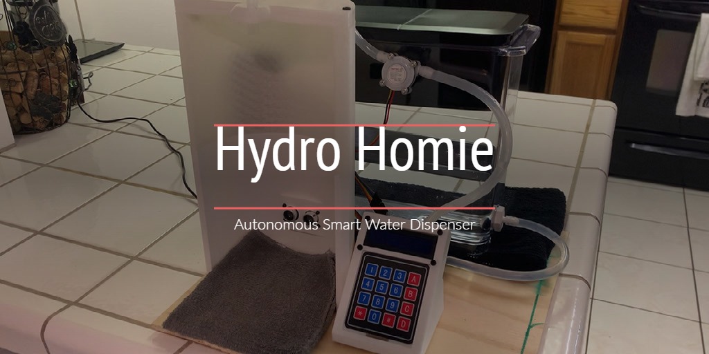 The HydroHomie is a home appliance automatic water dispenser that detects the presence of a vessel and dispenses water to a user-inputted amount through a keypad. This project was developed by a small project team of 3 as a final for the ME106 Fundamentals of Mechatronics course at SJSU.